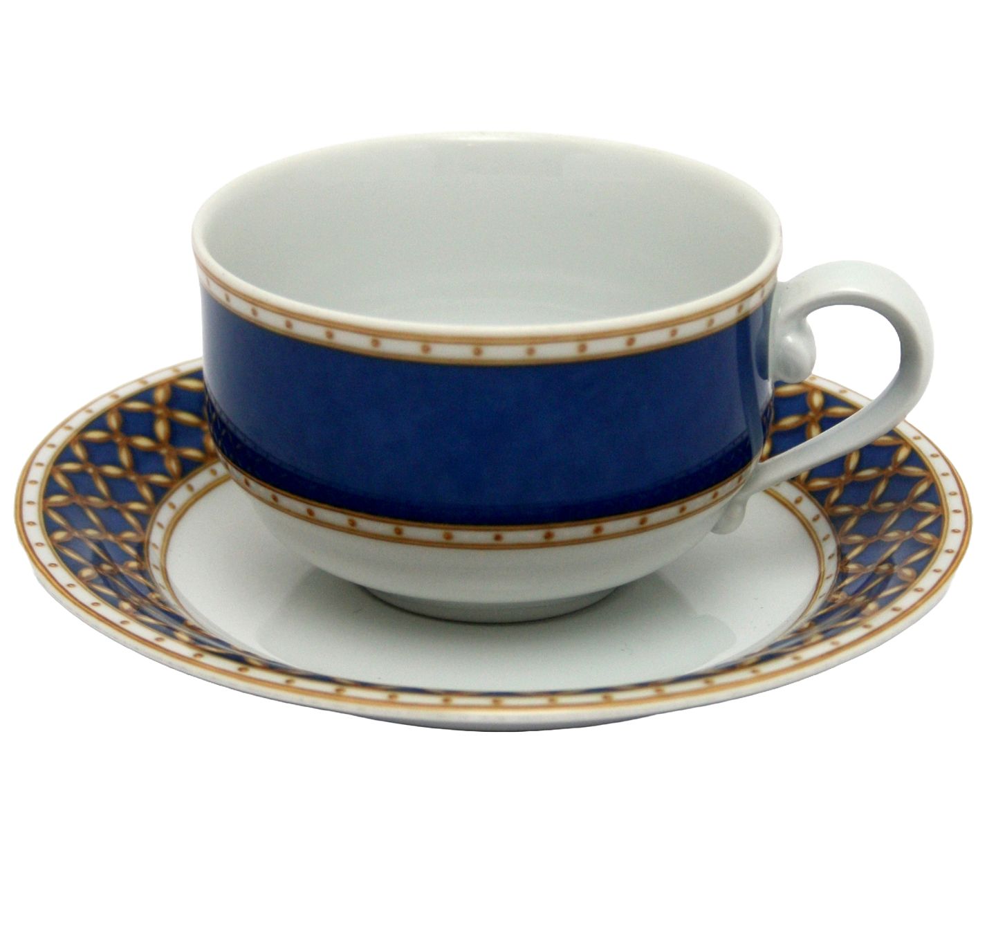 Royal Copenhagen, Ny Liselund designet af Diana Holstein i 2001. Tekop. Kongeblå med guld. Nr. 081. Højde 5,5 cm. Diameter 8,5 cm. Underkop Nr. 073 kongeblå med ternet guld diameter 14,5 cm. I. sortering. Pris: 150 kr. stk. Lager: 4