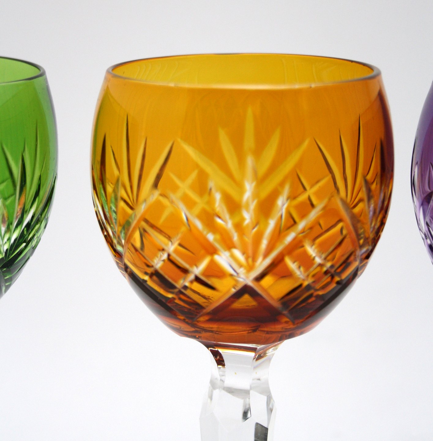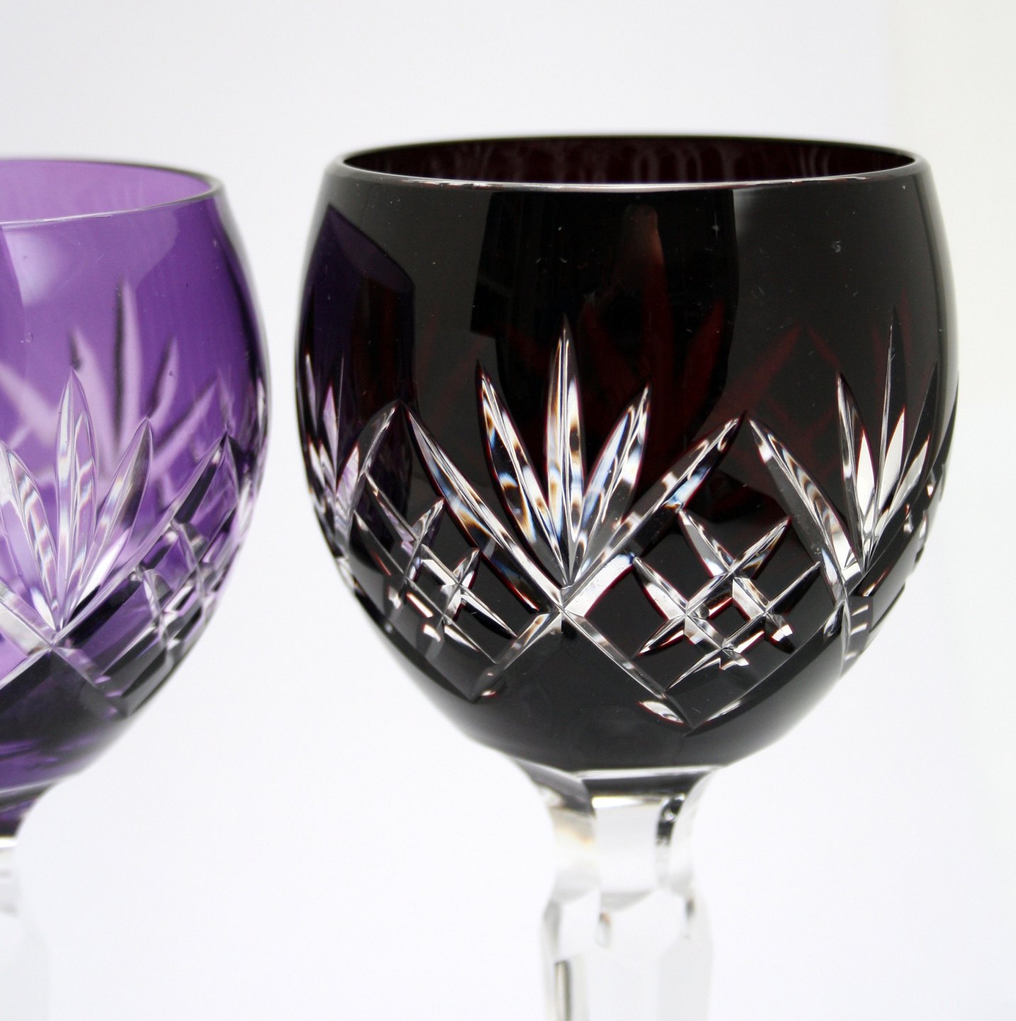 Bøhmisk krystalglas med slibninger på kumme og stilk. Lilla, Grøn, Bordeaux og Gylden. Højde 18,5 cm. Øverste diameter 6,5 cm. Pris for sæt på 4 glas: SOLGT