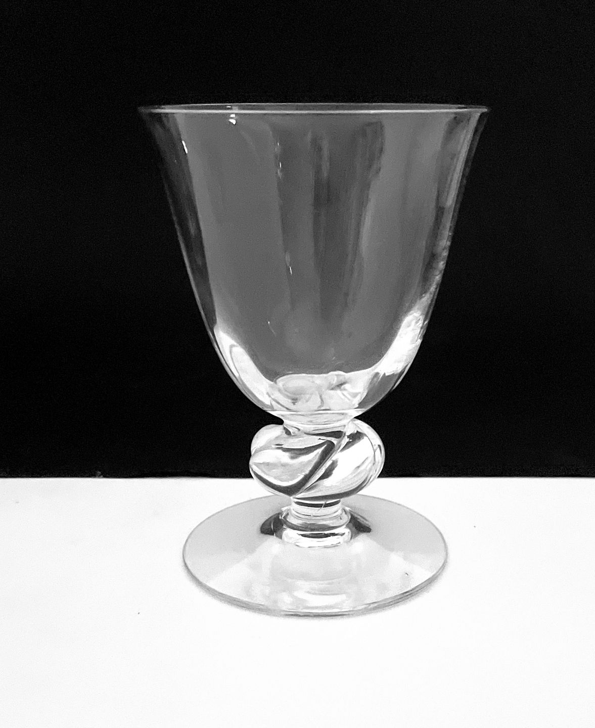 Holmegaard, Ulfborg, Klar hvidvin krystalglas med optisk stribet kumme og stærkt vredet stilk. Designet af Jacob E Bang i 1937. Udgår af produktion omkring 1970. Højde 10,7 cm. Øverste diameter 7 cm. Pris: SOLGT