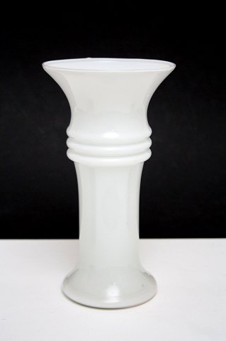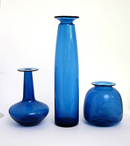 Fyens Glasværk, Dråbeformet blomsterløg, hyacinth glas/vase "net" mønster i maskinblæst presset støvblå glas. Fra 1960'erne. Højde 11,5 cm. Øverste diameter 7 cm. Største diameter ca. 9,5 cm. Pris: 325 kr. stk. Lager: 1