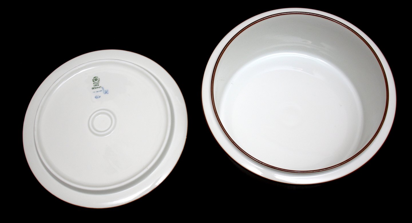 Royal Copenhagen, Brun Domino. Terrin med låg, lågfad. Nr. 14912. Diameter 20,5 cm. Højde med låg 9,5 cm. II. sortering. Flot stand. Pris: 600 kr. pr. stk. Lager: 1