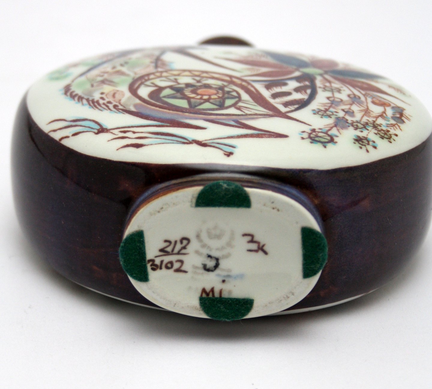 Royal Copenhagen kunstfajance, Tenera produceret fra 1958 og frem. Flad vase med fuglemotiv. Designet af den svenske kunsthåndværker Marianne Johnson. Nr. 217/3102. Signatur MJ. Højde 13 cm. Bredde 11 cm. Flot stand. Pris: 475 kr. stk. Lager: 2