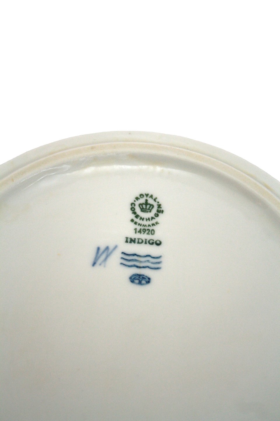 Royal Copenhagen, Indigo, Serveringsskål med låg,som også kan bruges som underfad. Hvidt porcelæn med indigoblå kant. Designet af Anne Marie Trolle i midten af 1970'erne, udgår i midten af 1980'erne. Nr. 14920. Højde med låg 8 cm. Diameter skål 15,5 cm. Diameter låg 21 cm. II. sortering, hvilket betyder at der kan være små produktionsfejl, låget har bla. en bobbel i glasuren. Pris: 450 kr. stk. Lager: 1