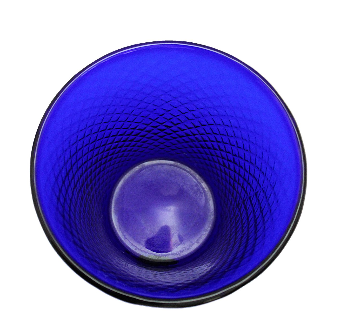 Urtepotteskjuler i Koboltblå glas med vaffelmønster. Højde 10,5 cm. Øverste diameter 14 cm. Rundsleben i bund. Fin stand med sort "brænding" eller lignende i bund. Pris: 225 kr. stk. Lager: 1