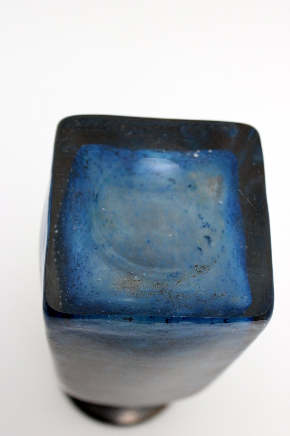 Kosta Boda, Firkantet vase i blå og brune farver. Designet af Bertil Vallien i slutningen af 1970'erne. Vasen er fra Boda, som er en del af Kosta Boda og Åfors glasbruk. Signeret "Boda bvallien 42723". Højde 22 cm. 7,5 x 7,5 cm. Flot stand. Pris: 575 kr.