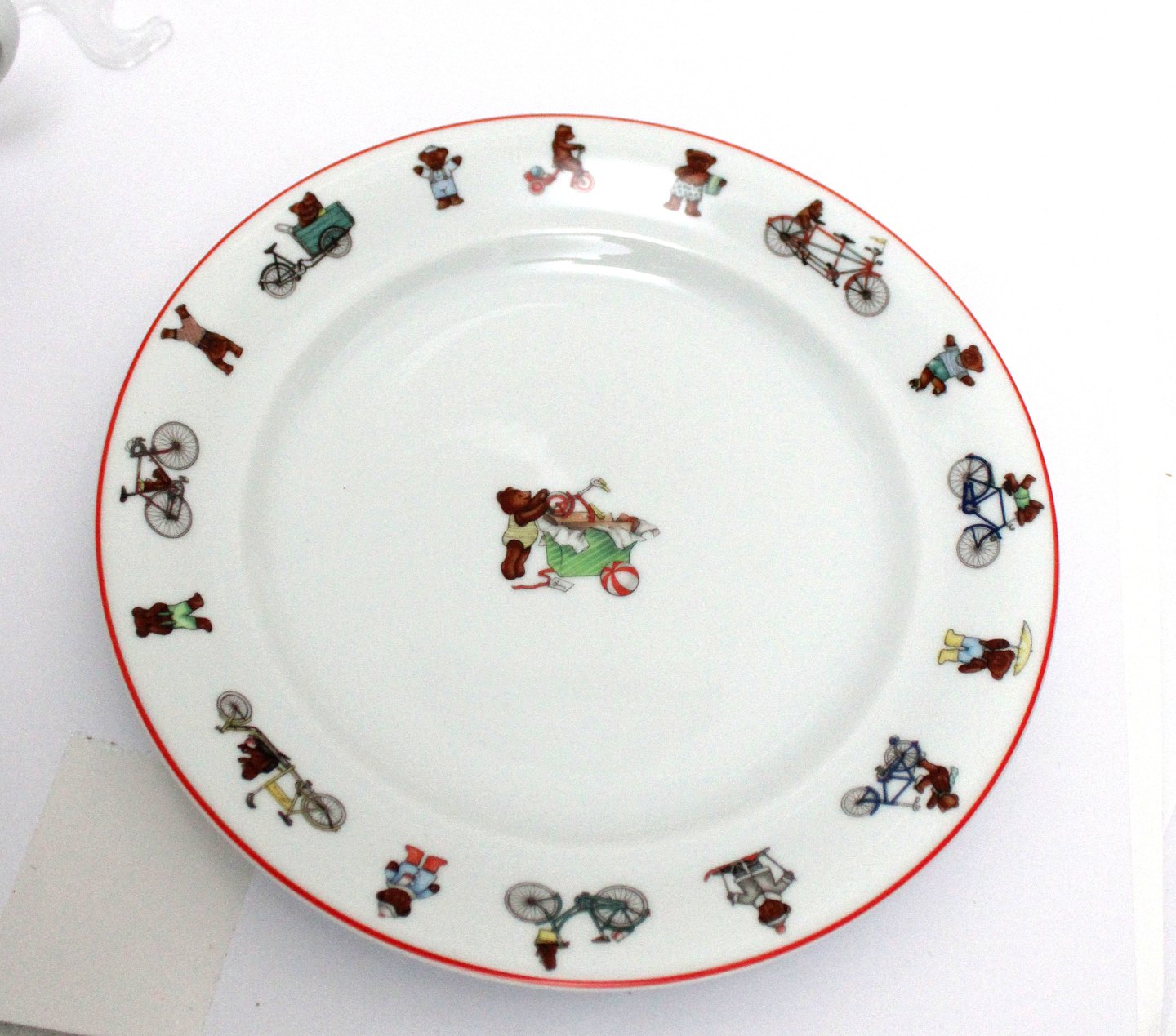 Flad tallerken, rød kant. Nr. 622. Diameter 22 cm. III sortering. Almindelig brugsslid i form af overfladeridser og lille chip på bundkanten den står på. Pris: 150 kr. stk. Lager: 1