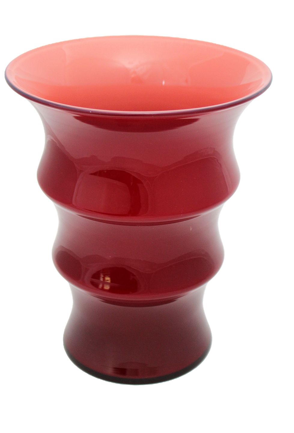 Holmegaard, Karen Blixen rød vase, støvet rosa indvendig. Designet af Anja Kjær fra 2000. Signeret. Vasens form er inspireret af afrikanske kvinders hals og armringe. Højde 17 cm. Diameter 14 cm. Pris: SOLGT