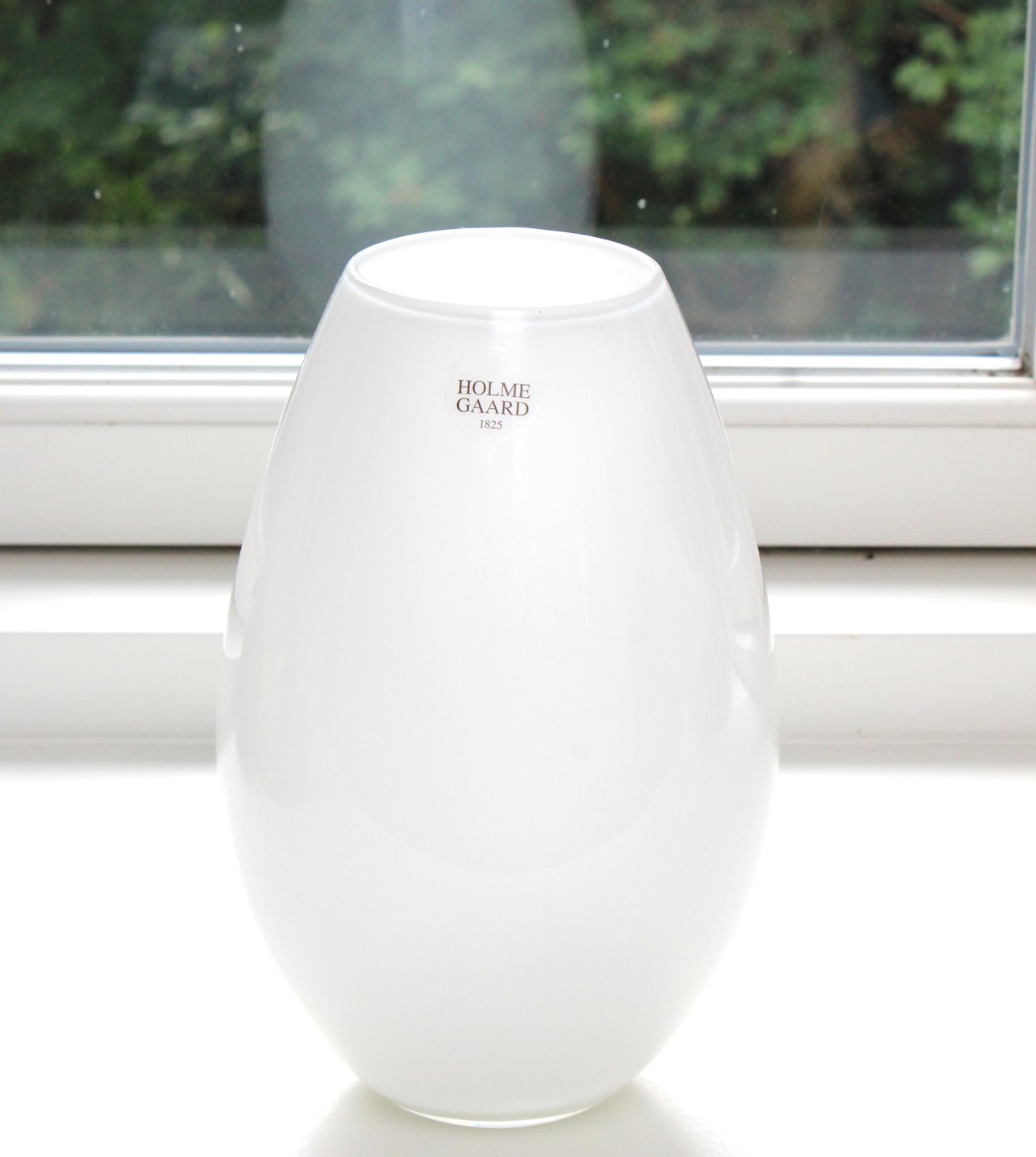 Holmegaard, Cocoon vase i hvid opaline glas. Designet af Peter Svarrer i 2005. Peter Svarrer starter på Holmegaard i 1997 og er kaldt for lysets mester, manden der bragte Holmegaard ind i det nye millennium efter Michael Bang og Per Lütken. Højde 17 cm. Øverste diameter 5,8 cm. Ingen signatur. Fin stand. Pris: 275 kr. stk. Lager: 1