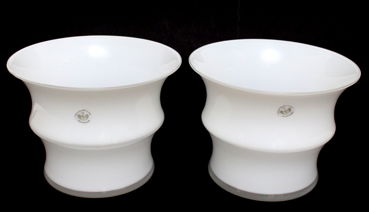 Højde 16 cm. Diameter 20,5 cm. Holmegaard label og signatur i bund. Pris: 550 kr. stk. Lager: 2