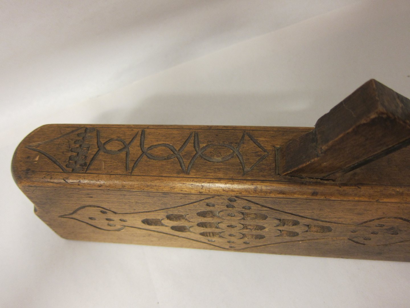 Listehøvl, antik Fra ca. 1800 Smukt dekoreret med udskæringer. Vi har et stort udvalg af høvle og andet håndværktøj. L: 25cm Varenr: 41962 Kontakt os for mere information