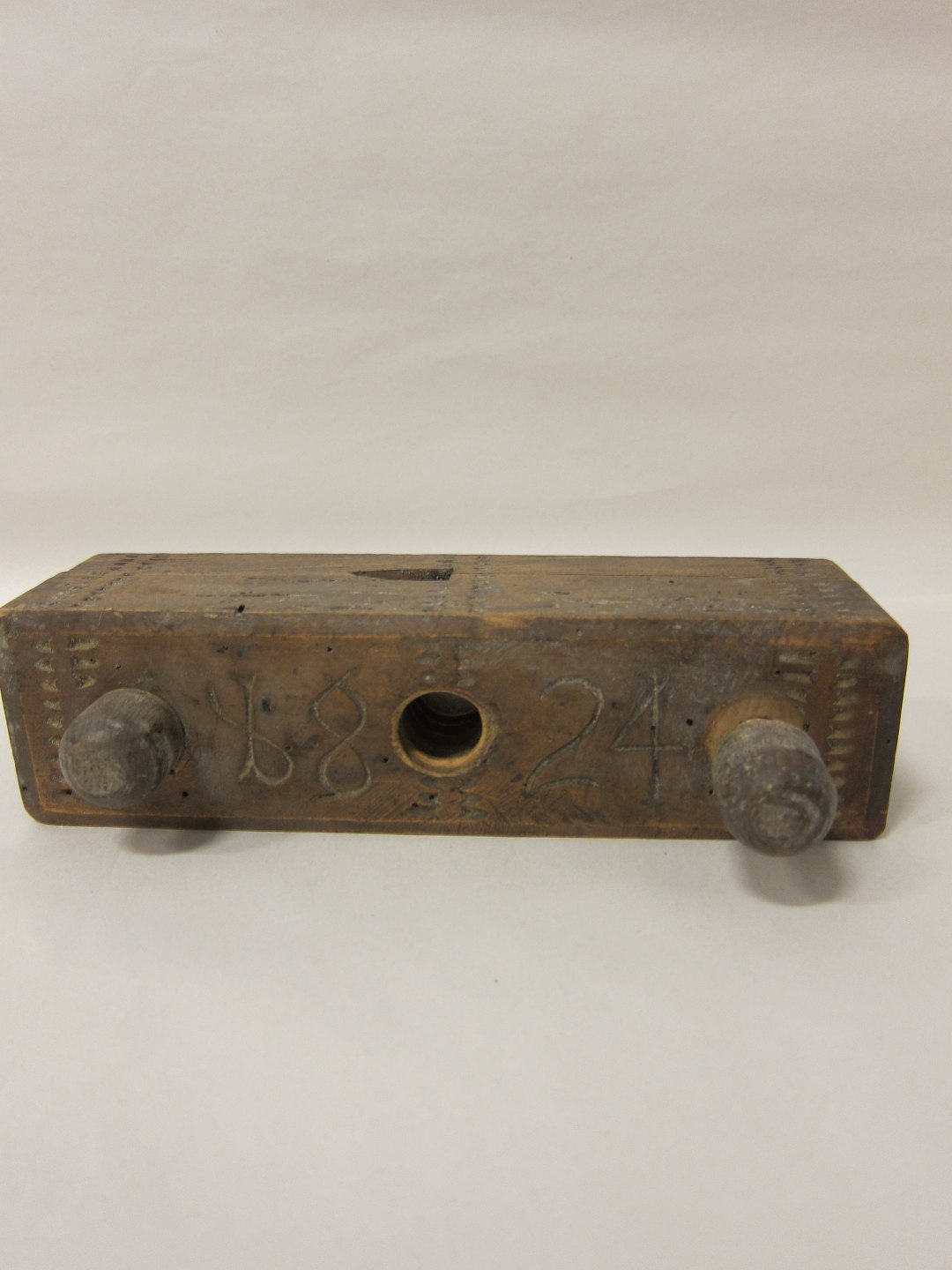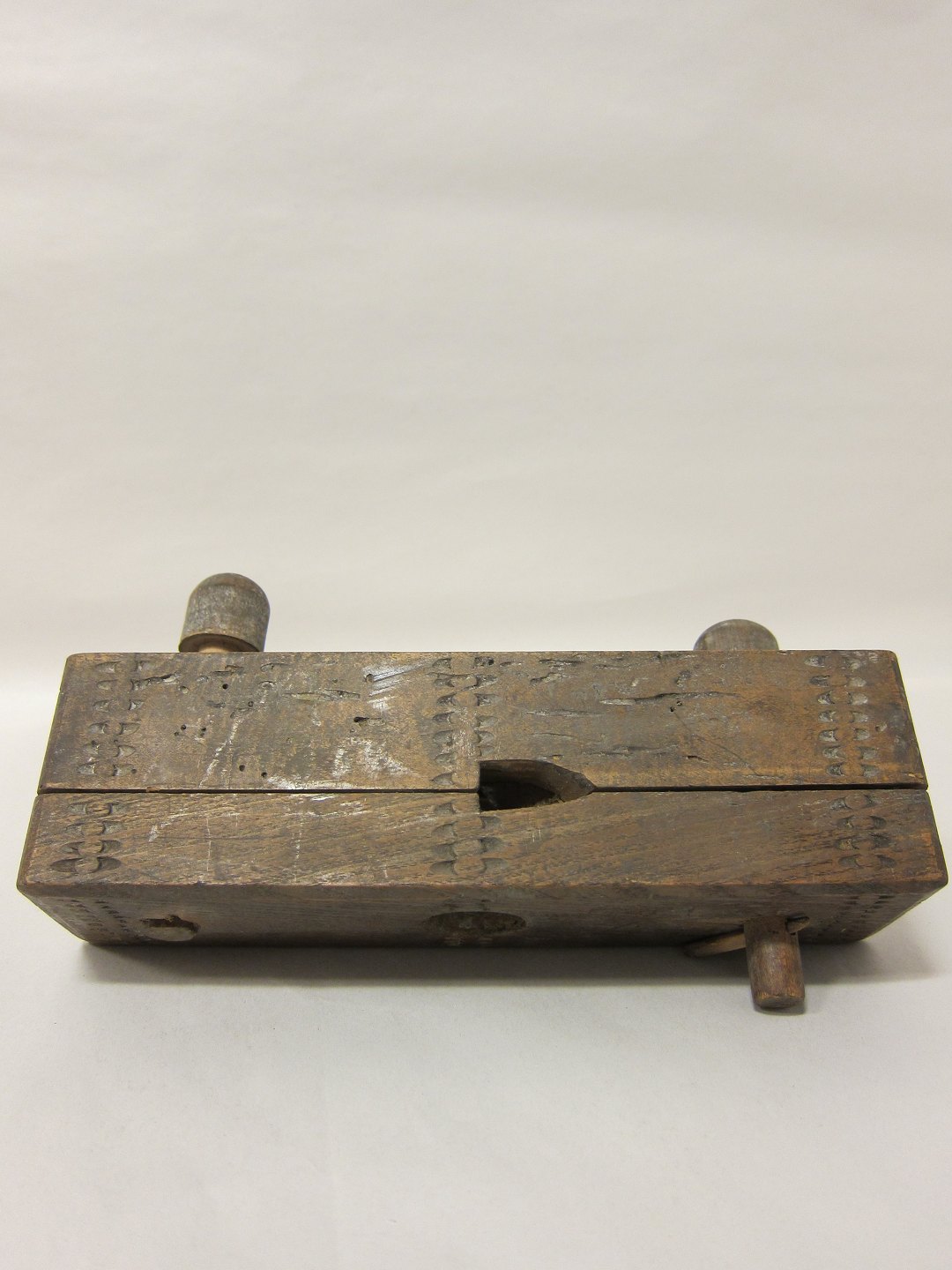 Gevindskærer Antik gevindskærer i træ fra1824 Smukt dekoreret med udskæringer L: 24,5cm Vi har et stort udvalg af andet håndværktøj Kontakt os for mere information Varenr.: 41962