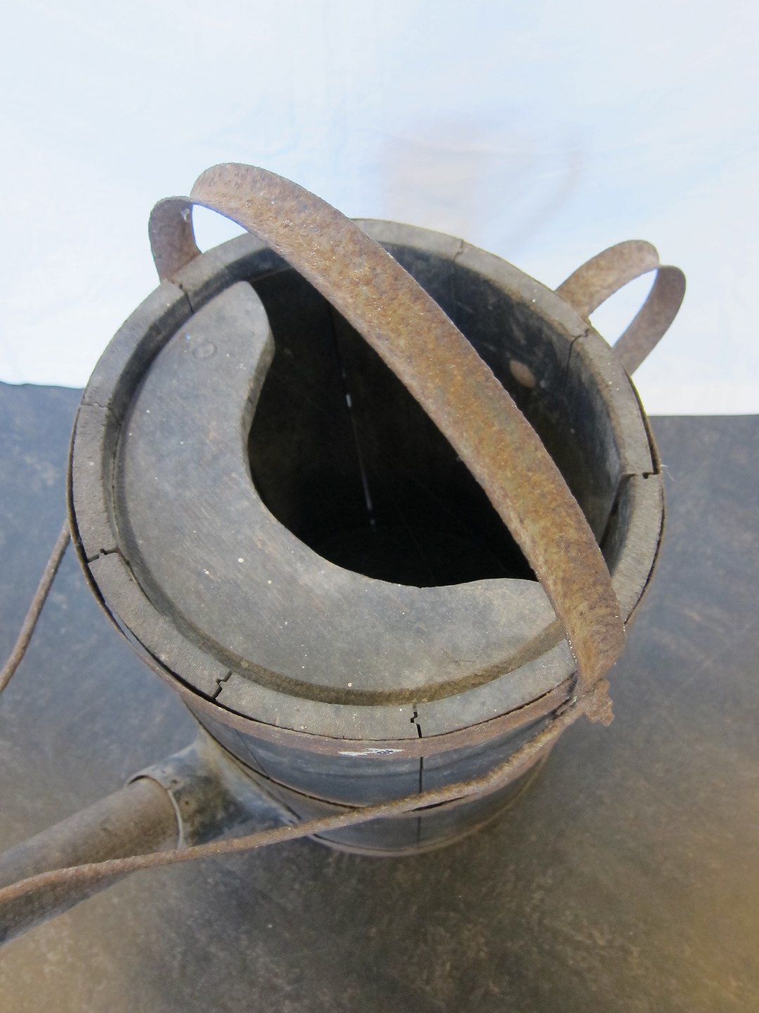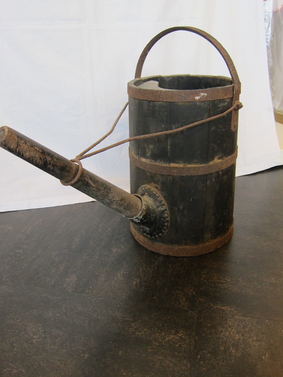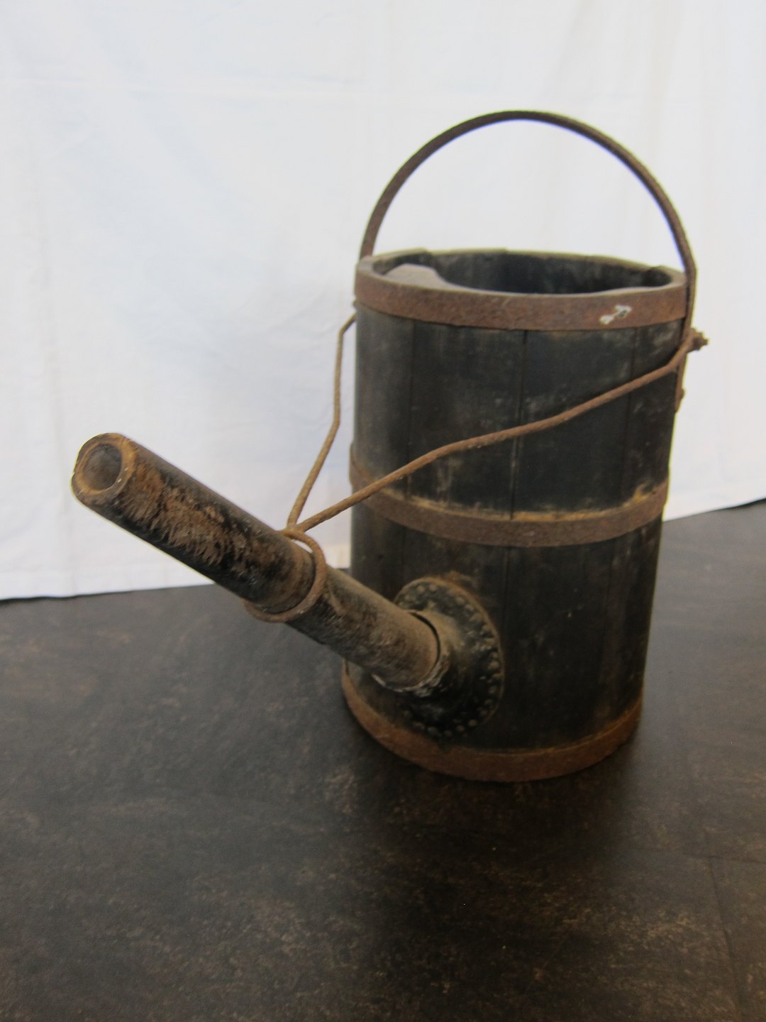 Gammel vandkande i træ og jern med lang tud