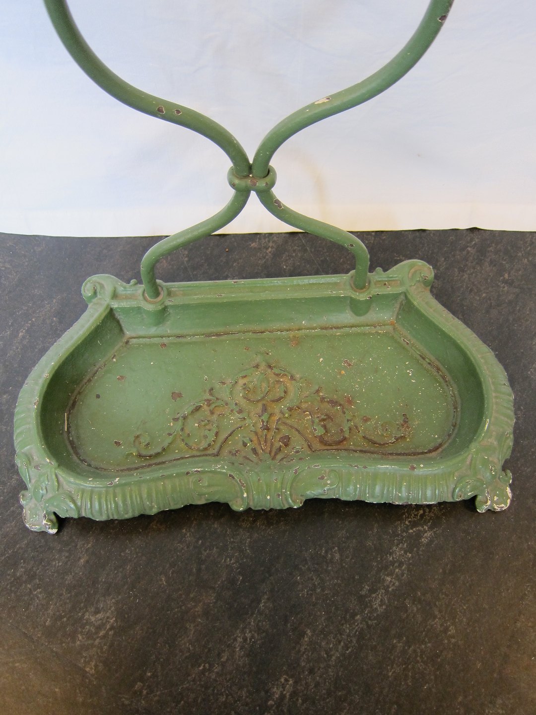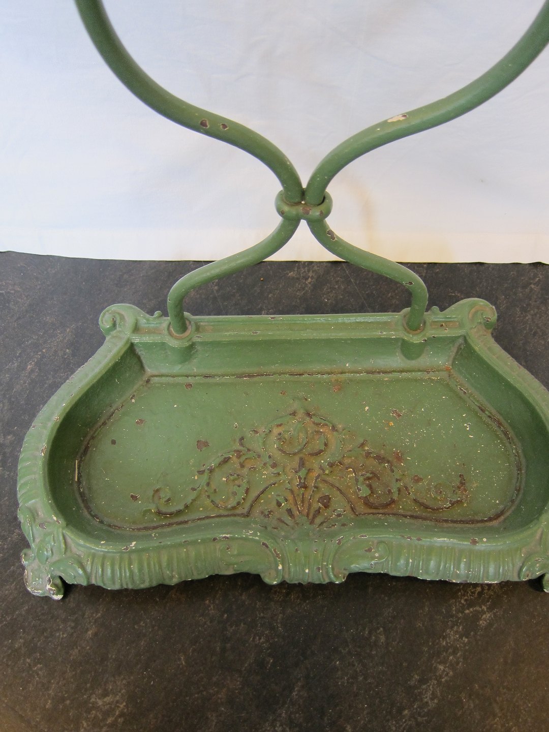 Schöner alter Schirmständer aus grüngemaltem Eisen mit schönen Formen und Dekorationen