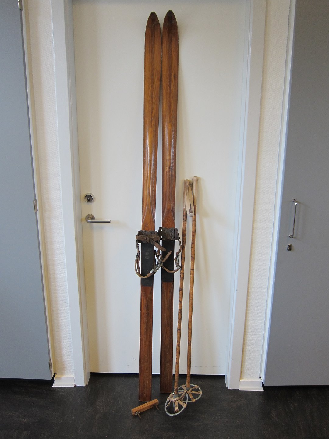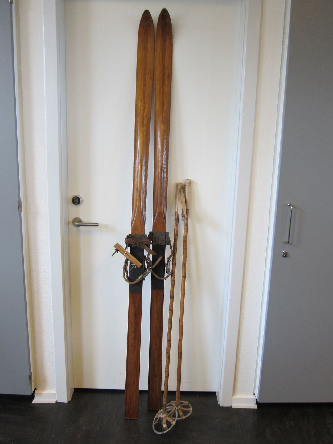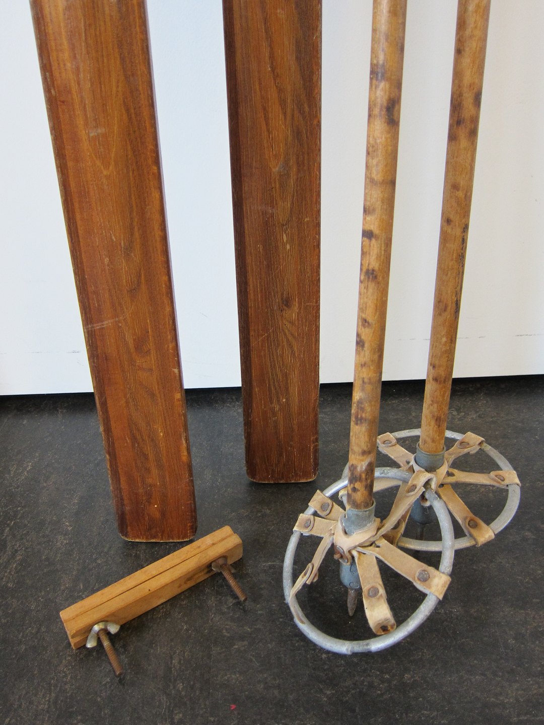 Old Cross-country ski made of wood with bindings and ski sticks (please take a look at the photos)