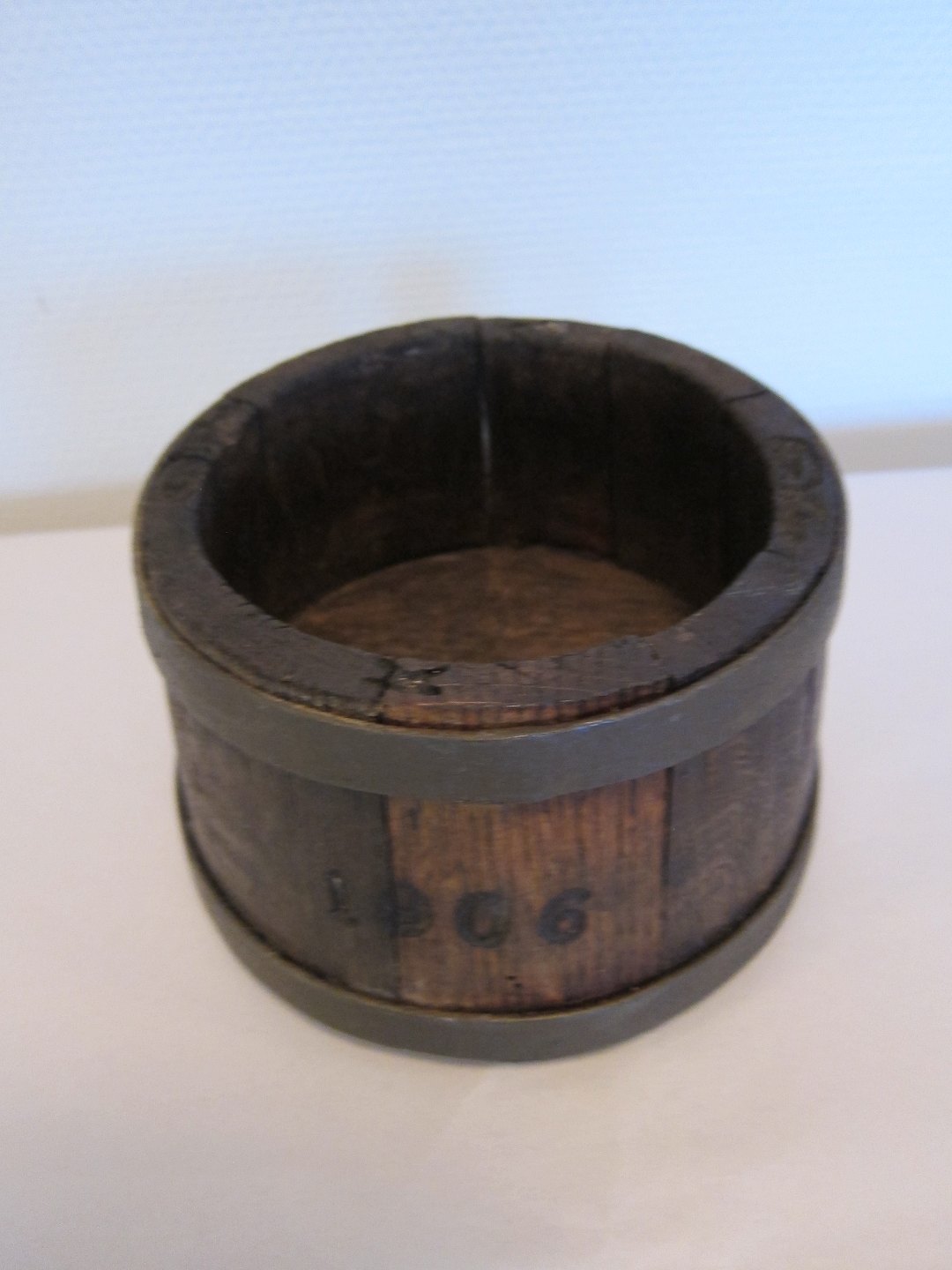 Skæppemål af træ fra 1906 Med jernbånd, 1/16-skæp Stemplet D top: 15,5cm, D bund: 17,5cm Varenr.: 411171