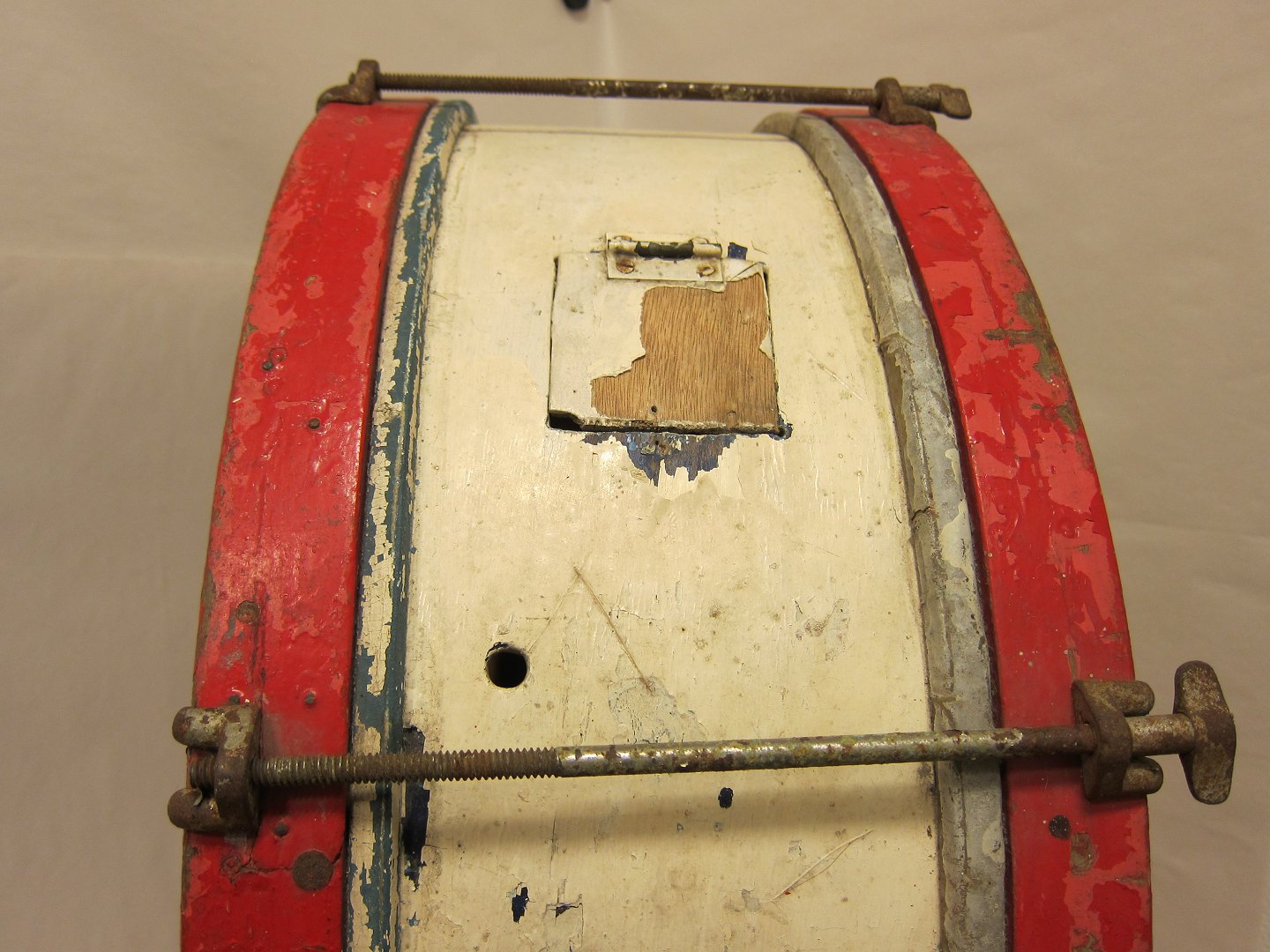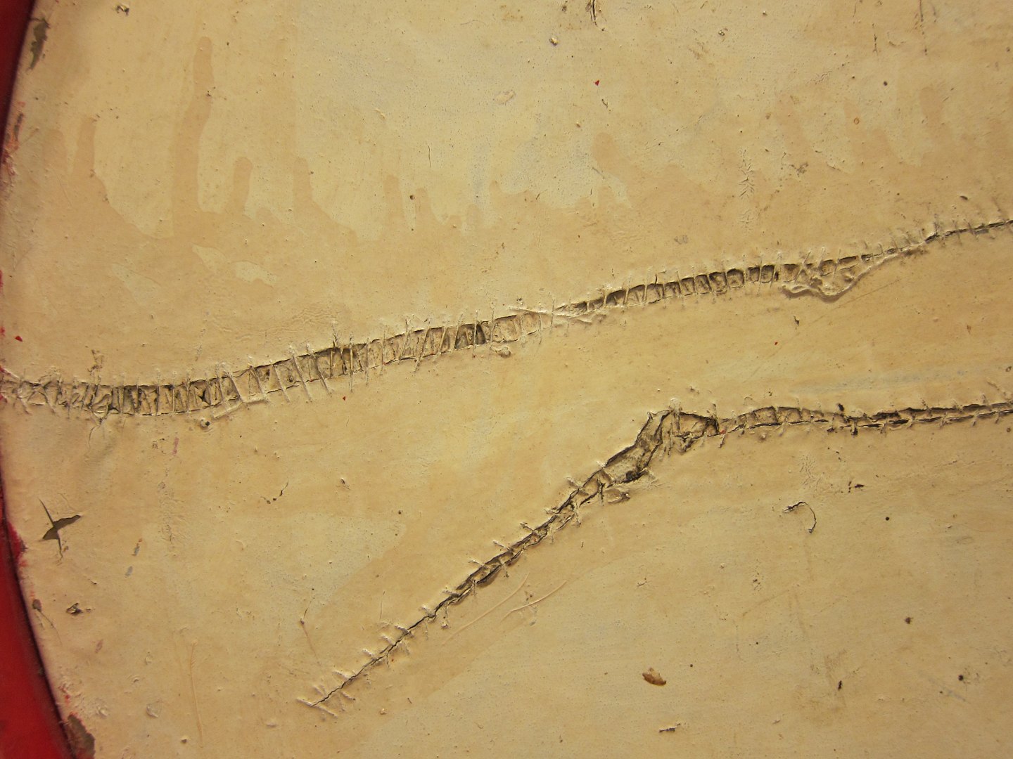 Bemærk reparationerne af skindet, da det var vigtigt at bevare de gamle skind
