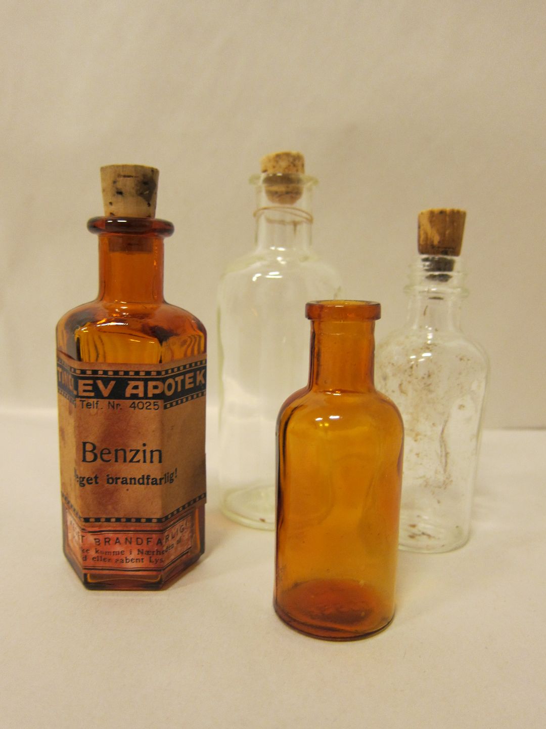 Forrest tv: SOLGT Brun med etikette "Benzin Meget brandfarlig", fra Tinglev Apotek, med prop, H: 10,5cm, Dkr.: 150,-
