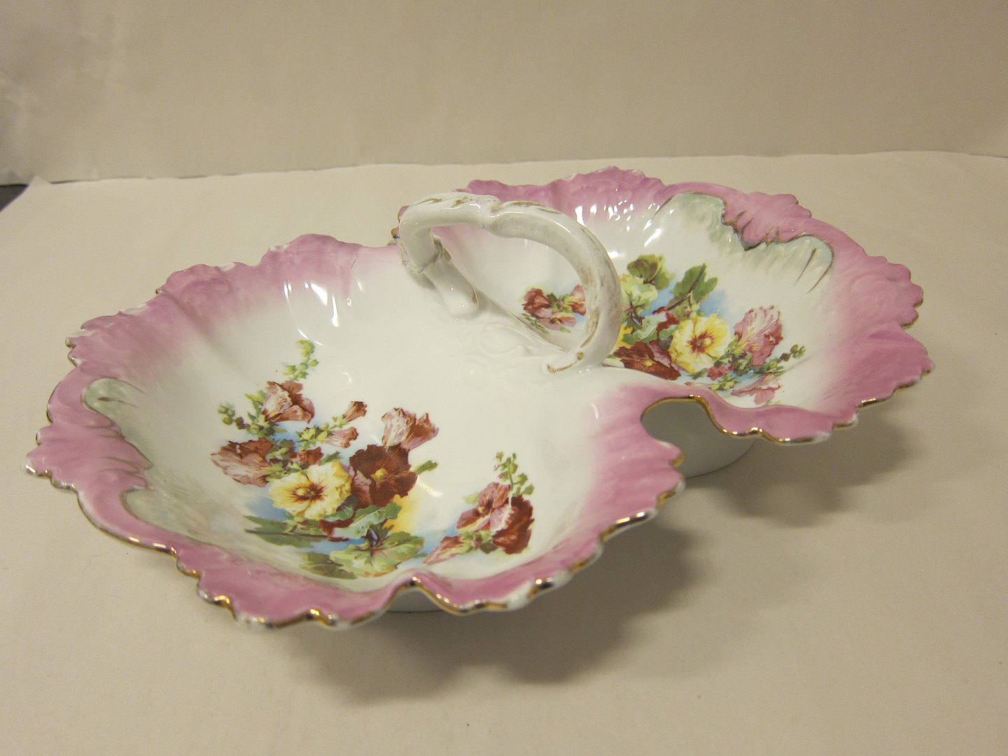 Utrolig dekorativt antikt fad, som er 2-delt med en meget smukt formet hank. Se de smukke dekorationer.