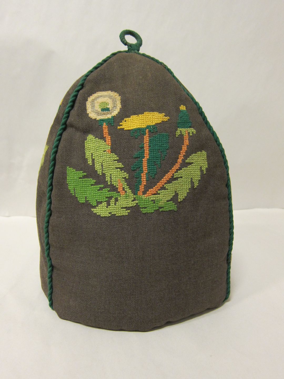 Smuk, gammel, håndbroderet tehætte med blomstermotiv
