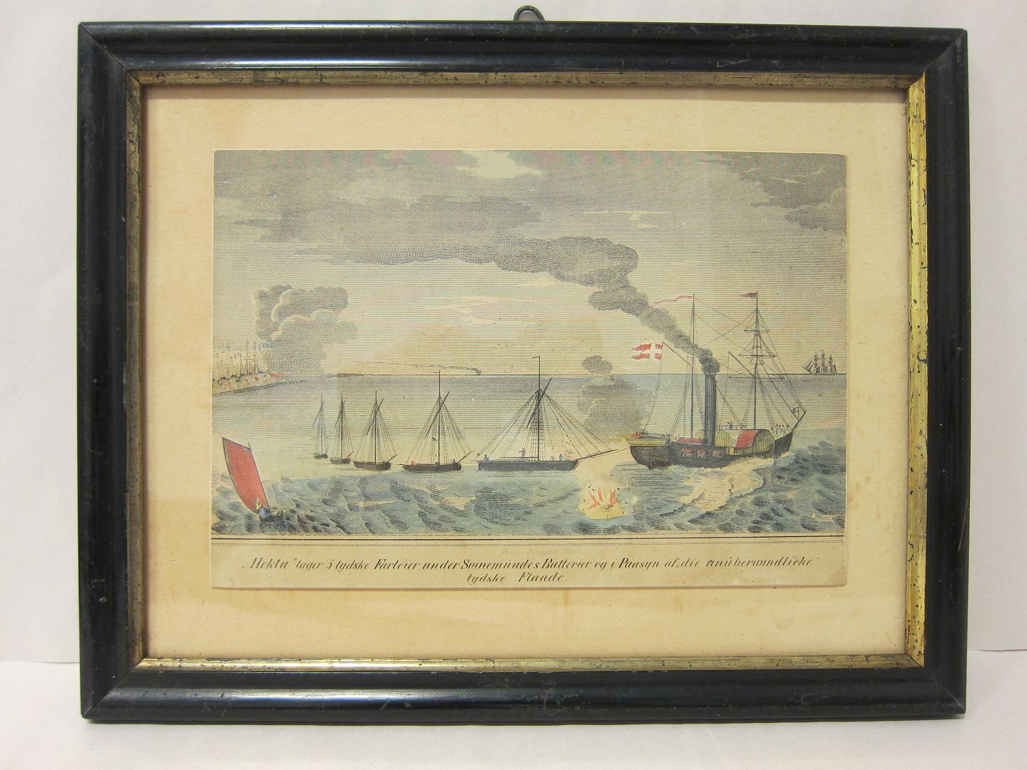 "Hekla tager 5 tydske Fartøier under Svinemündes Batterier og i Paasyn af die unüberwindliche tydske Flaade" "Fa.... Østergade No. 69"