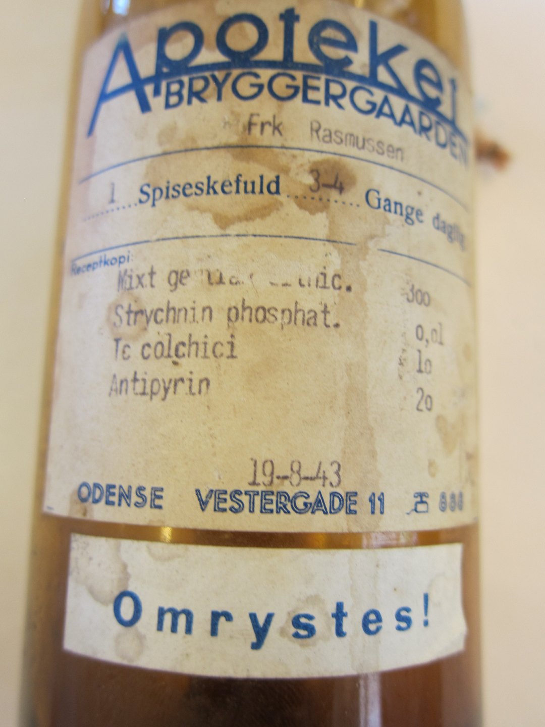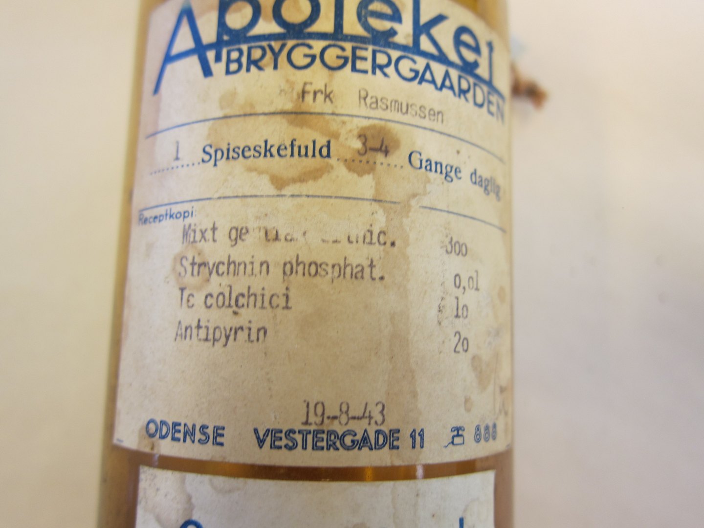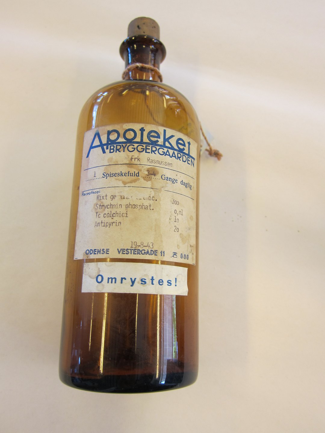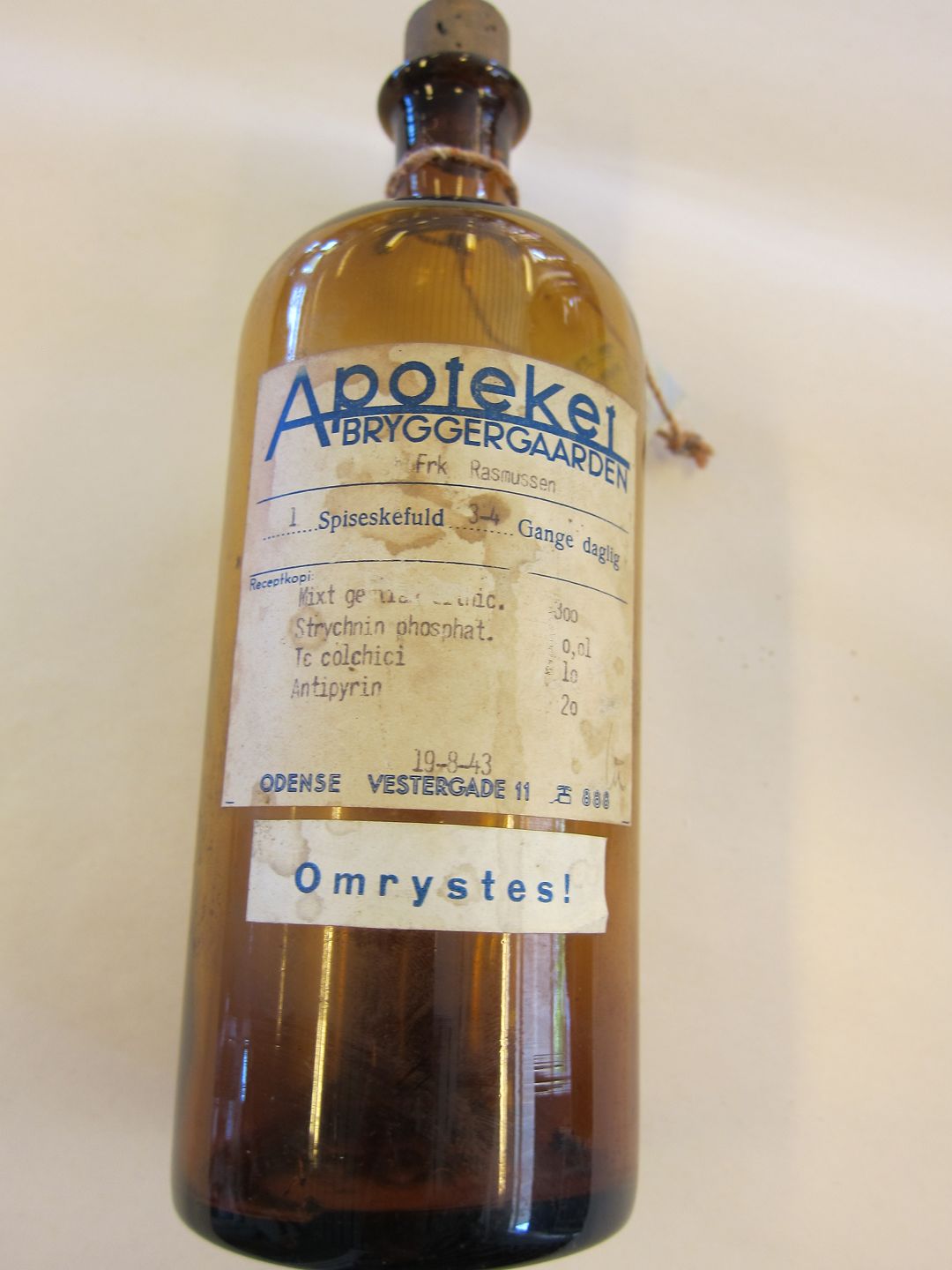 Etiketten på flasken er intakt, og den har indeholdt en mixtur med bl.a. Strychnin phosphat.