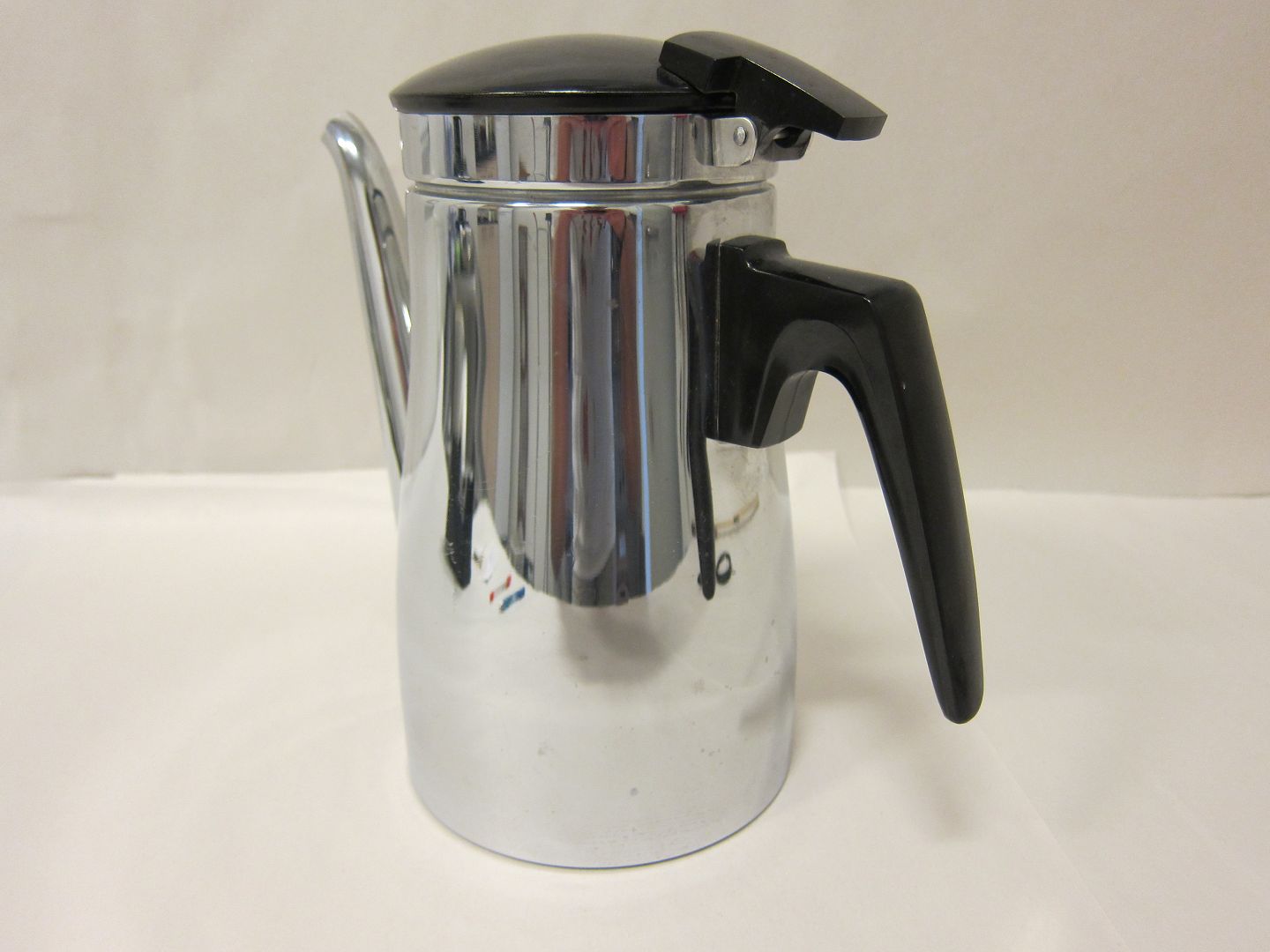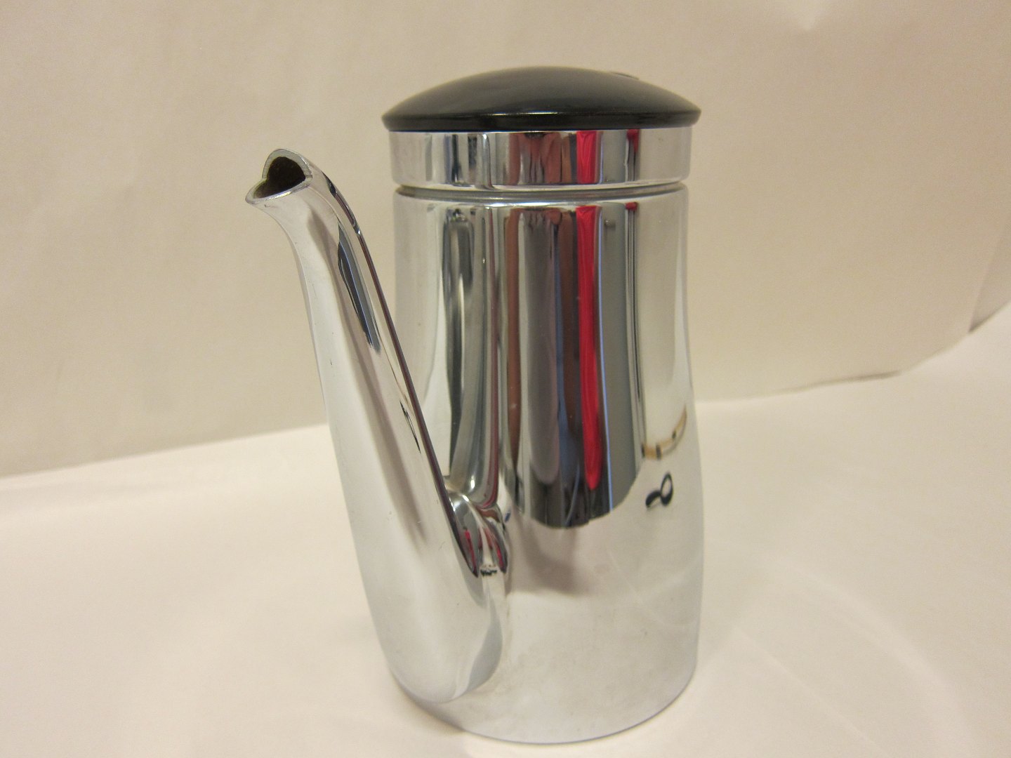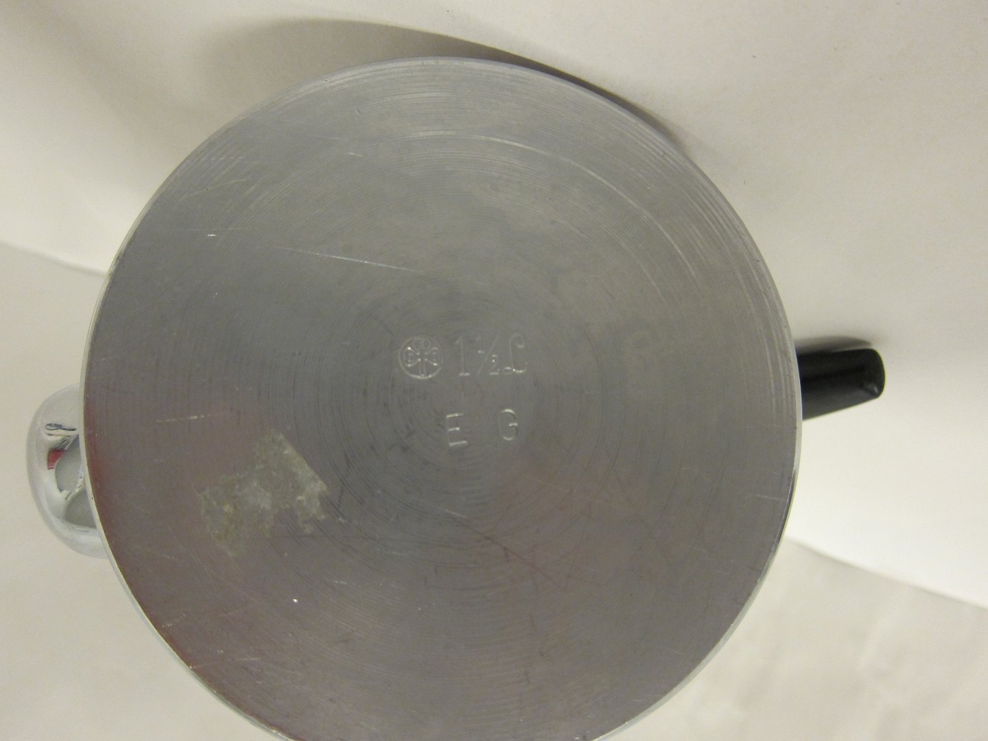 Kaffeekanne aus blankem Aluminium mit schwartzem Bakelit Haltegriff und Deckel