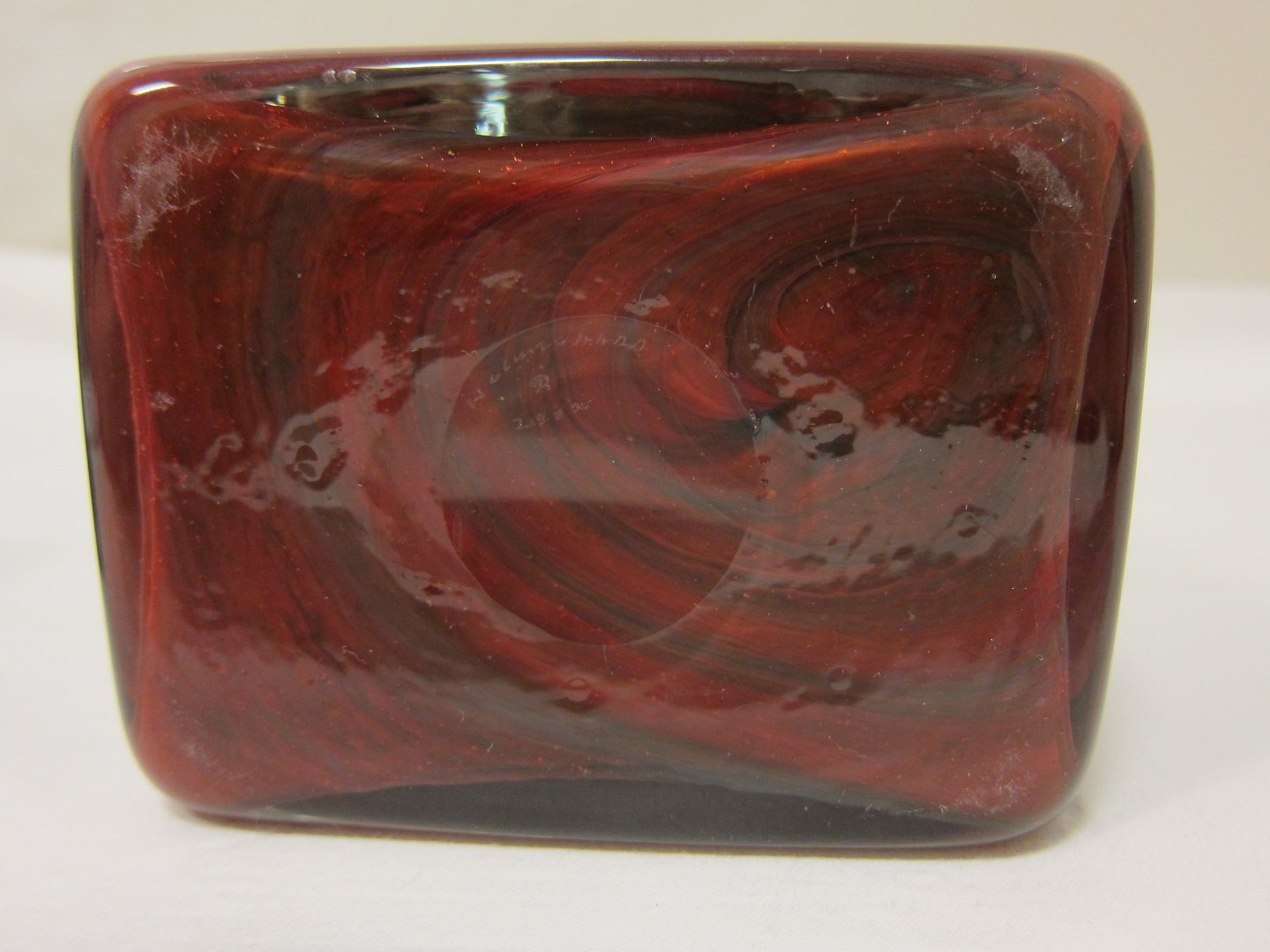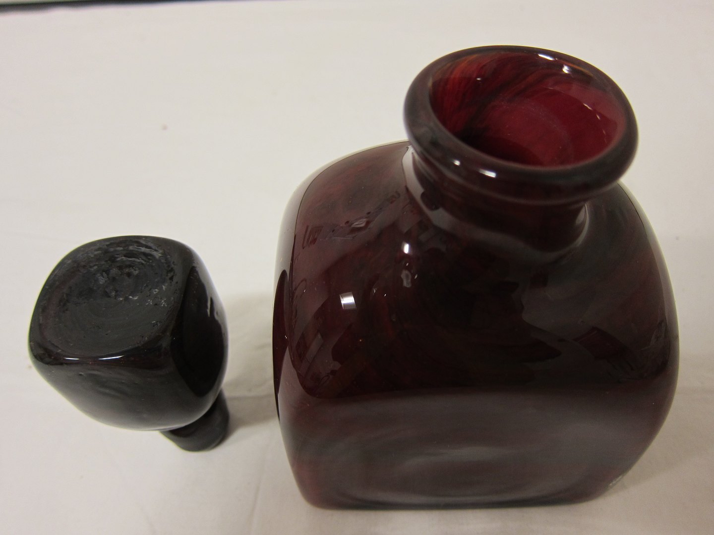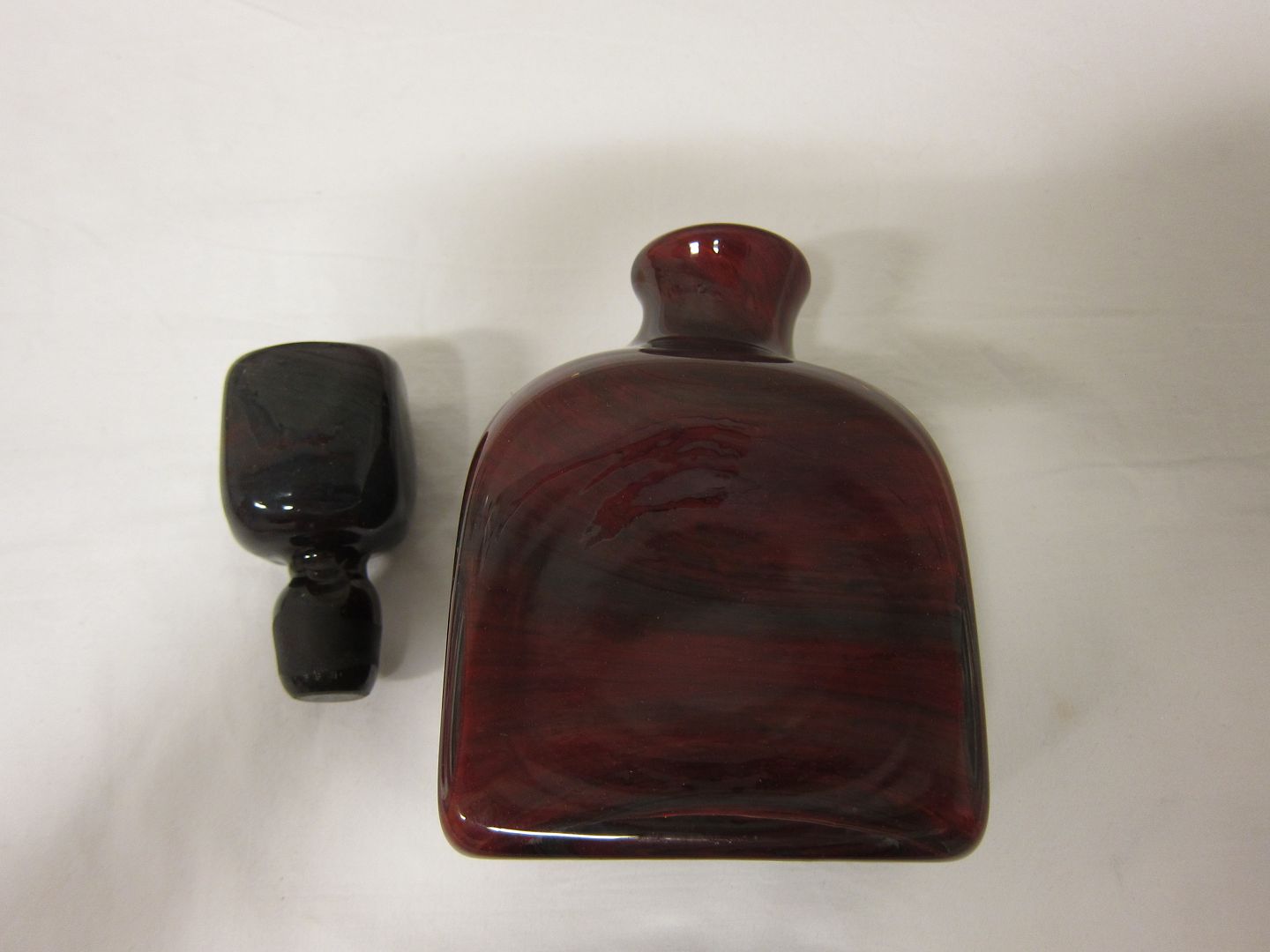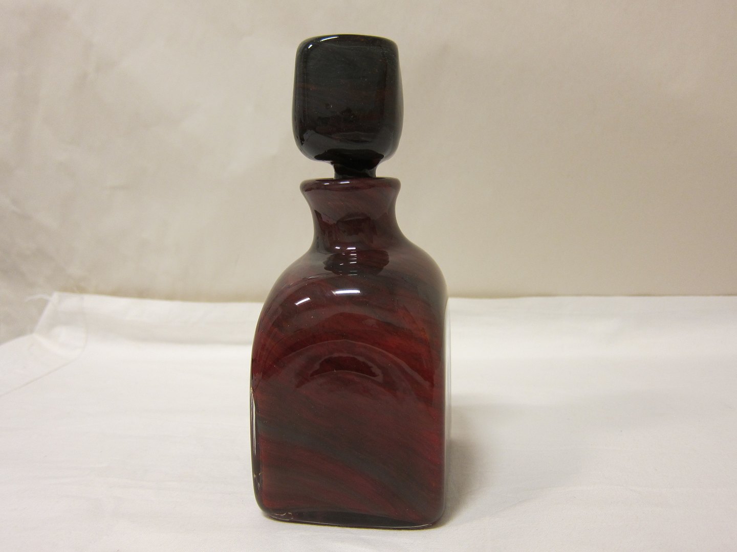 Unika karaffel i kraftigt, smukt mundblæst, let flammet glas i "mørk rav"-farve og lidt rød/lilla farve