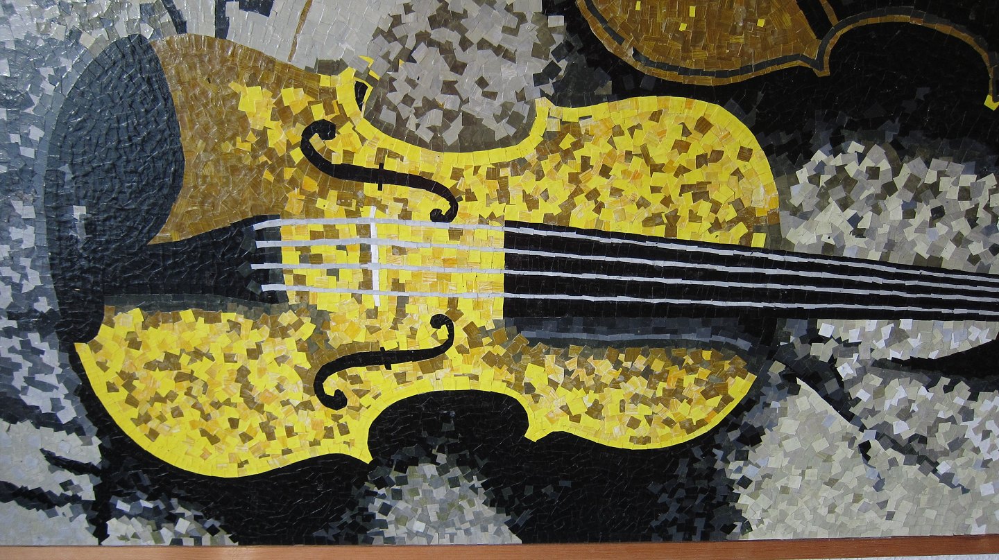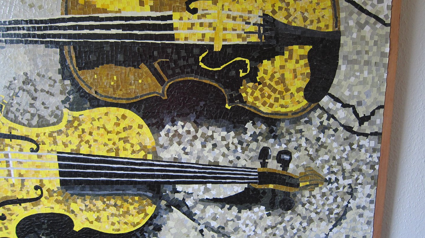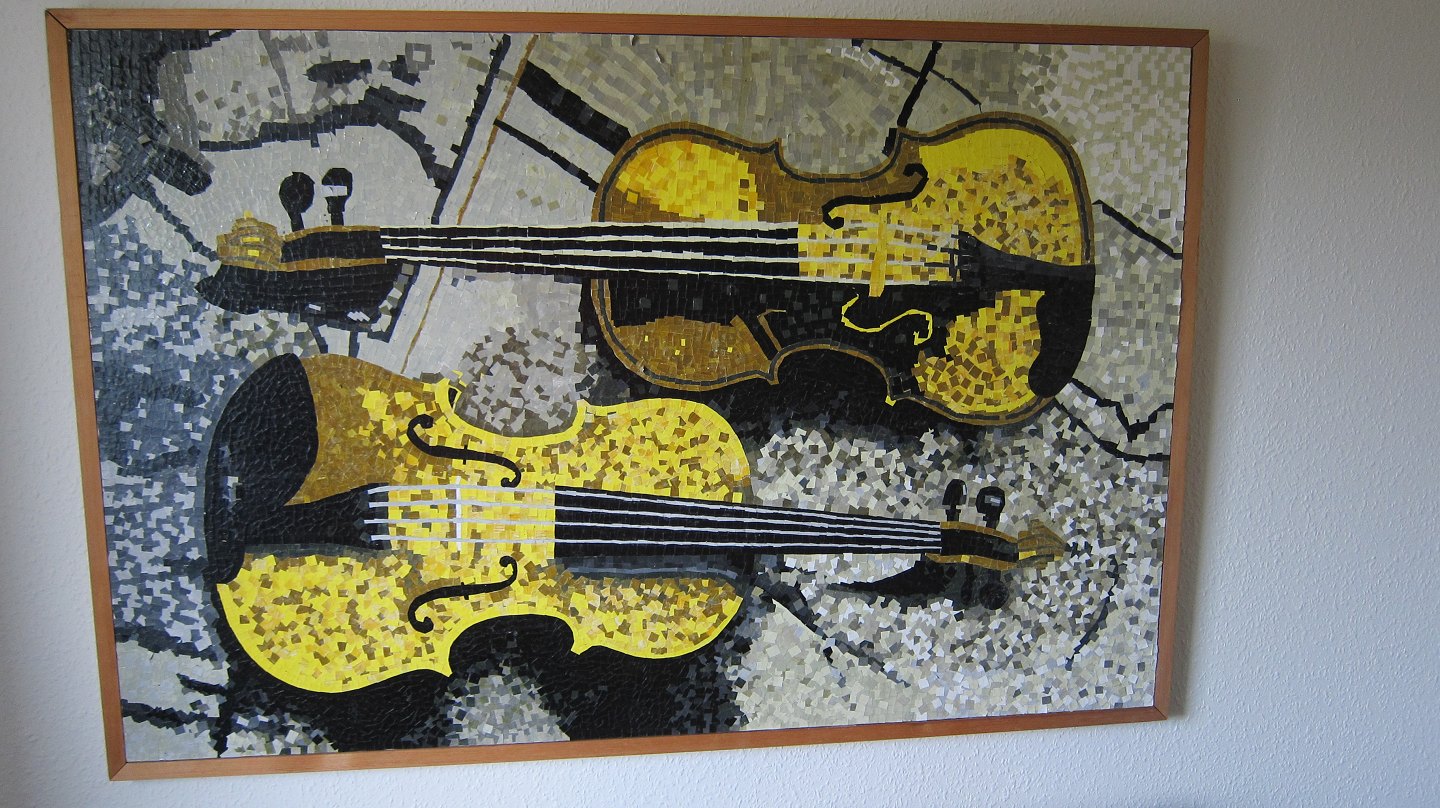 This unique decoration is constructed of many tiny pieces of paper placed at a wooden plate