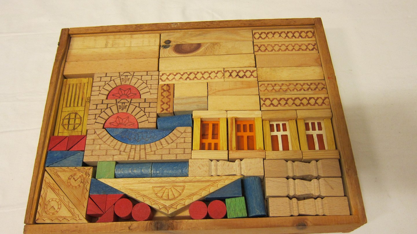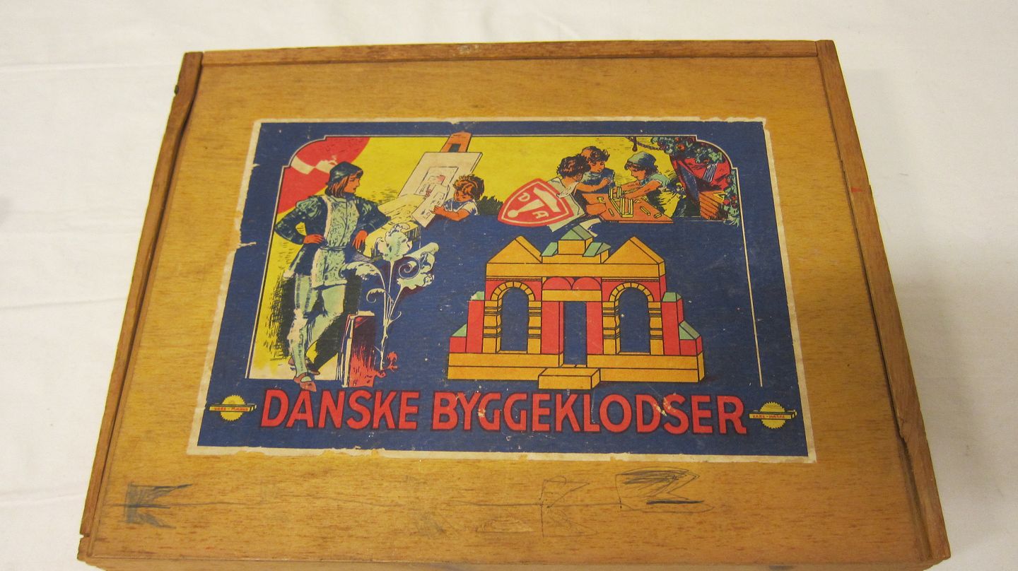 Den store træske indeholdende de gamle danske træ-byggeklodser
