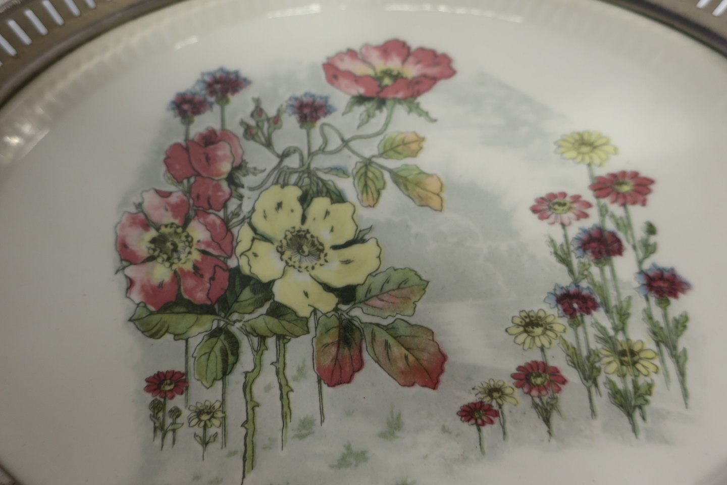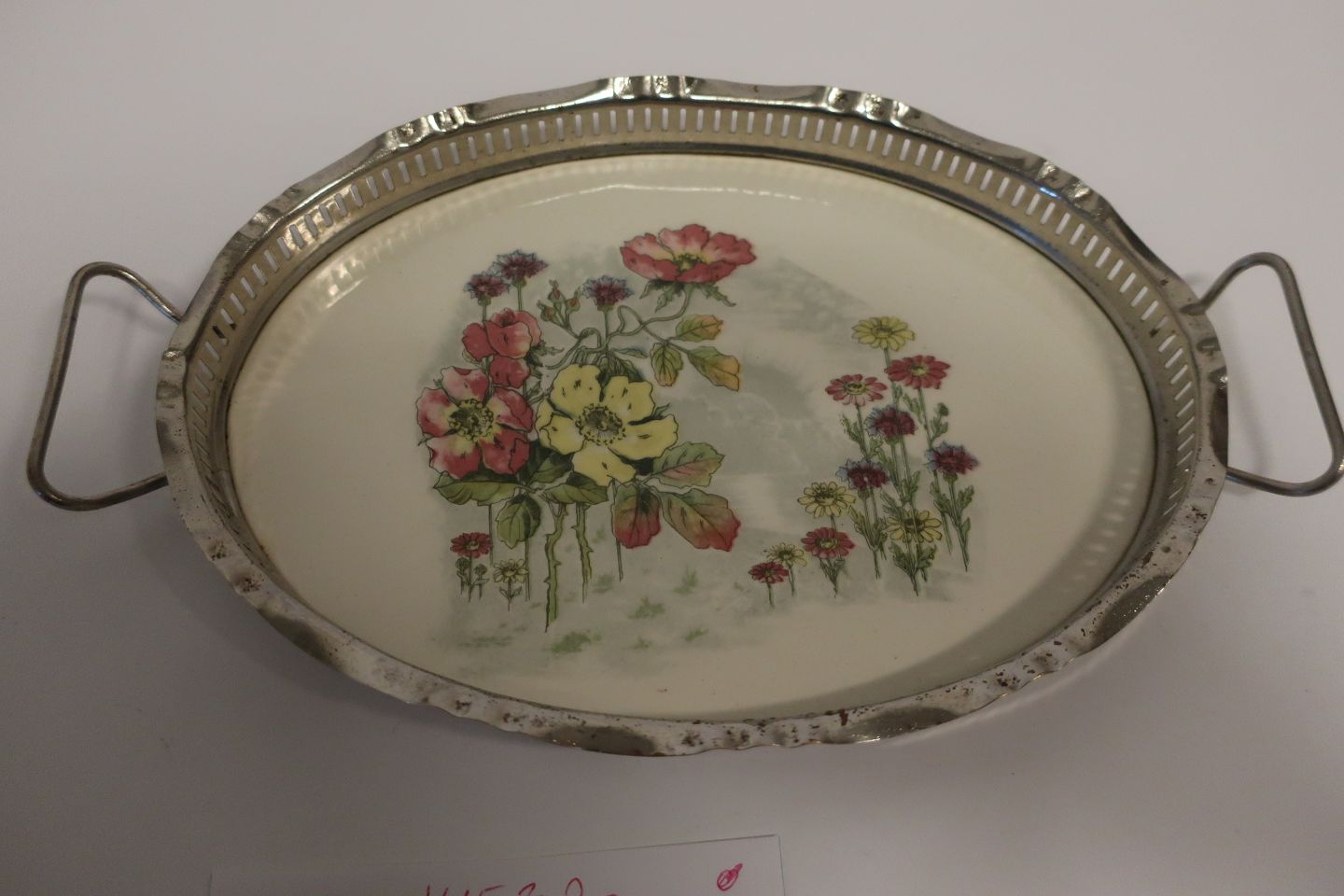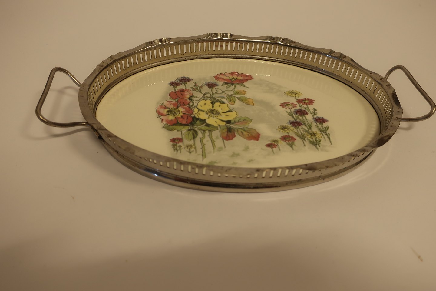Lille bakke lavet i porcelæn med blomster samt smuk besætning og 2 hanke