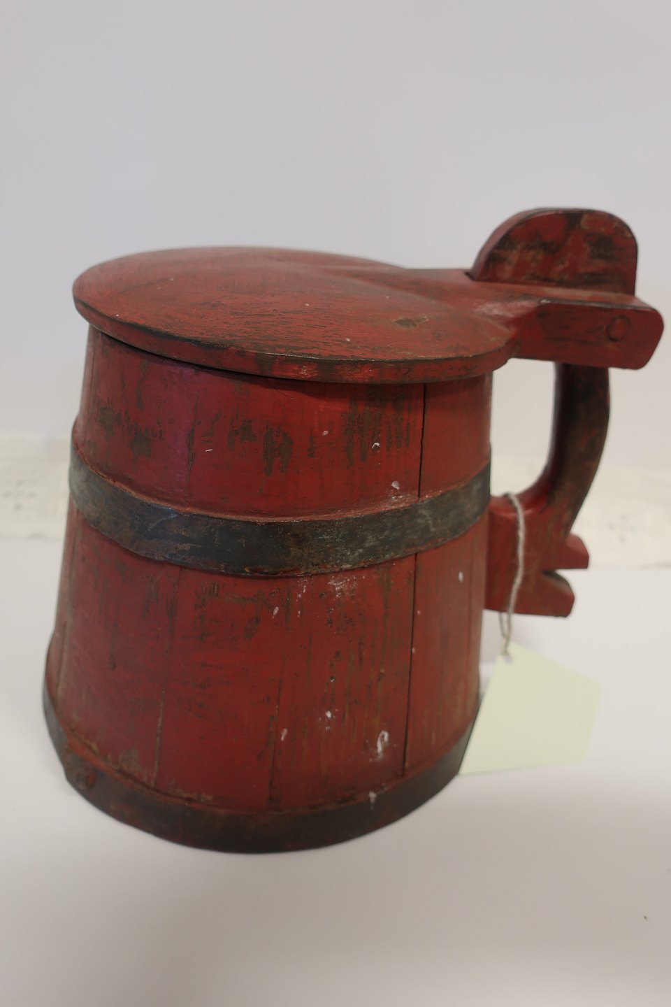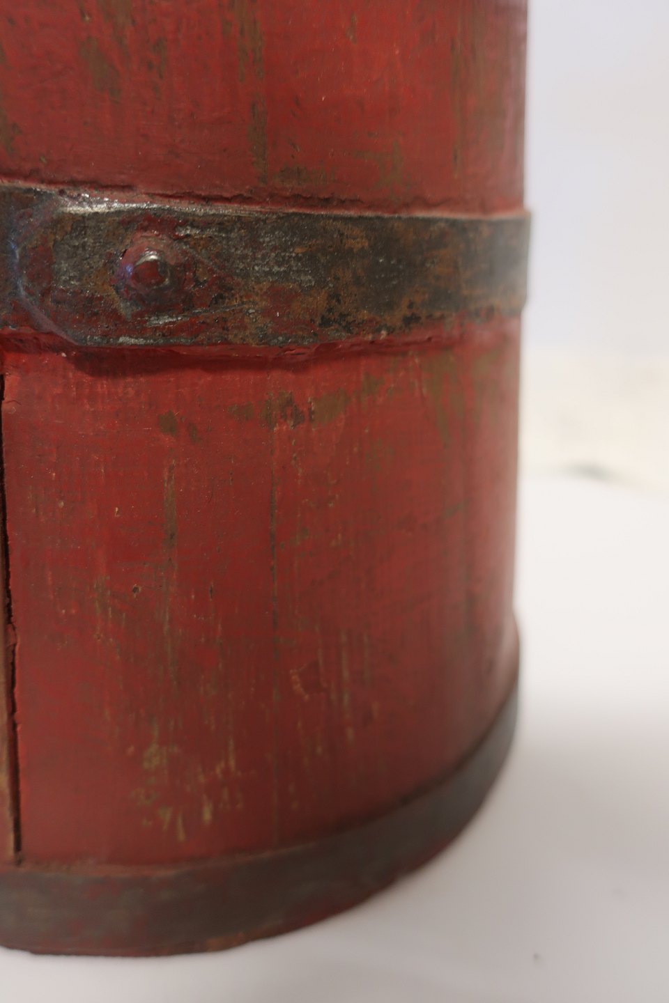 Antik ølkande i træ fra Nordfyn Med jernbånd Fra 1800-tallet H: ca. 23,5cm ved højeste sted (hank) Diam: ca. 23cm for selve kanden Meget flot stand Varenr.: 411171