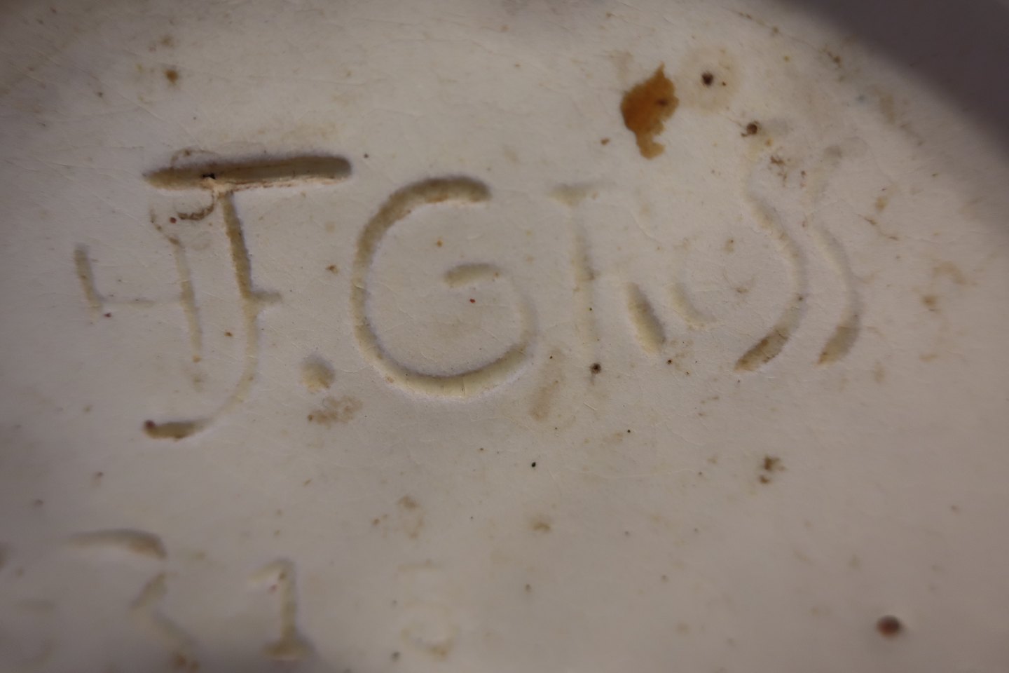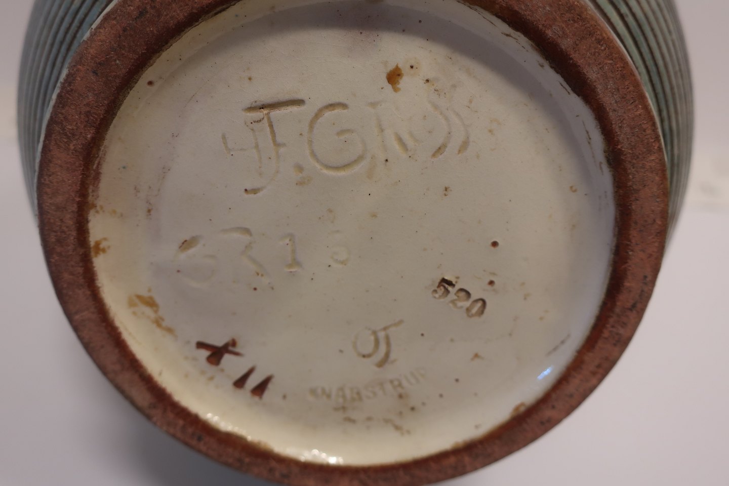 Stor gulvvase i smuk, blank glasur i afdæmpet grøn farve med gul/brun dekoration