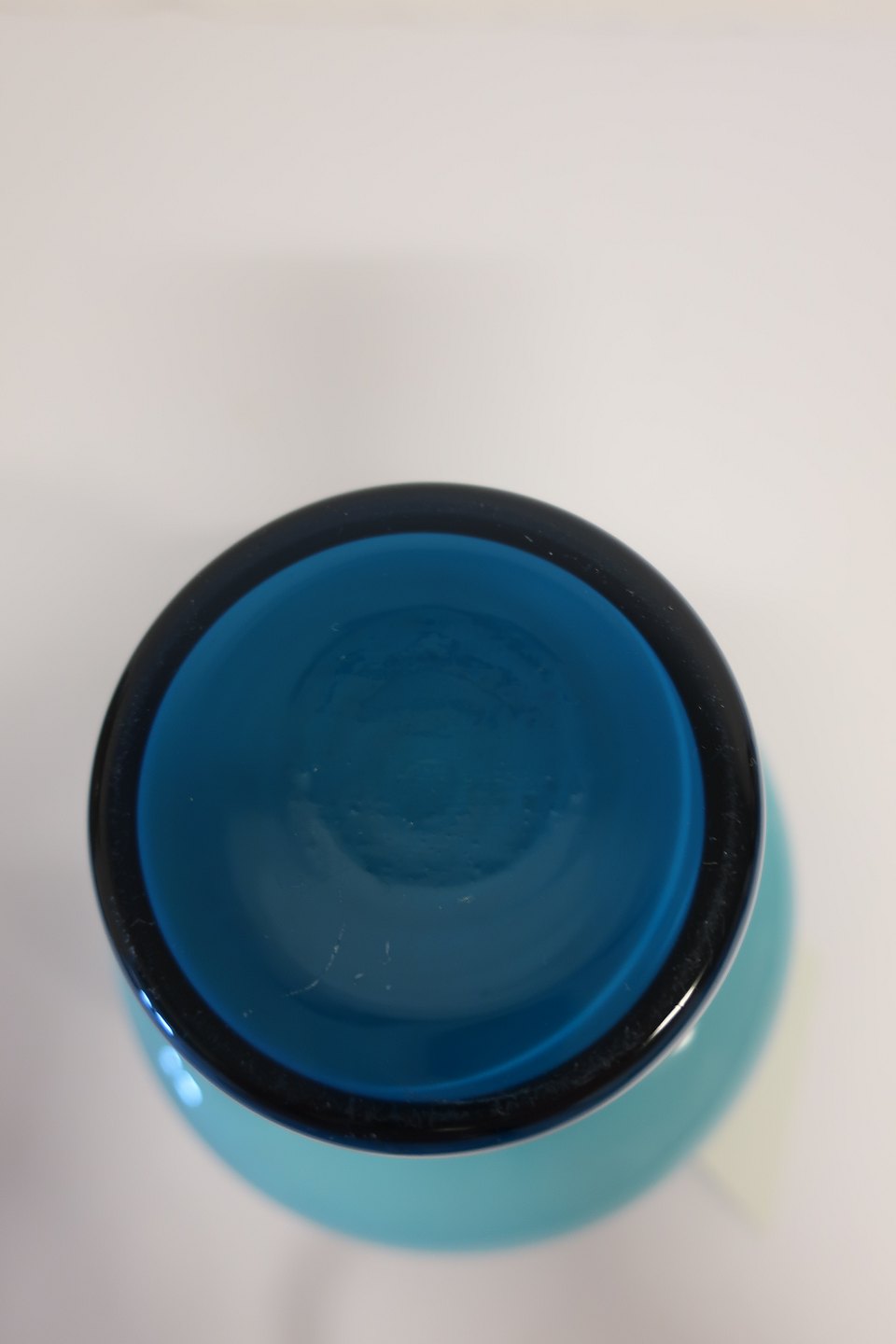 Carnaby Vase fra Holmegaard / Fyns Glasværk Turkis blå med inderside af opal hvidt glas Design: Per Lütken (1916-1998) Produceret i perioden 1968 - 1976 H: 15,4cm Flot stand Varenr.: 910113
