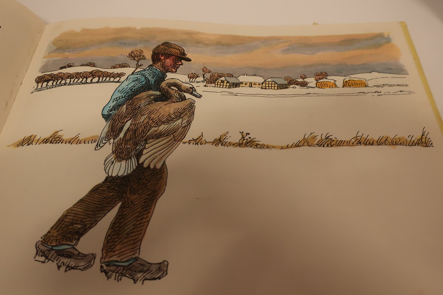 Den grimme ælling af H.C. Andersen Med smukke illustrationer af Johannes Larsen, den berømte tegner, særligt kendt for hans smukke tegninger af fugle Udgivet af Gyldendal Med aldersspor, men velbevarede sider Varenr.: 4-0276