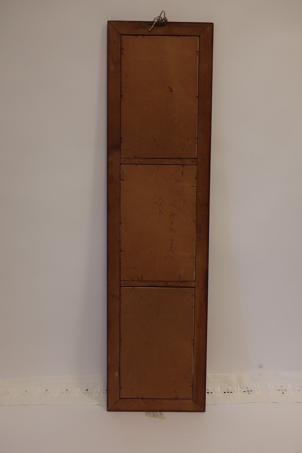 Bagside af træ, hvorpå er håndskrevet: "Skab vest syd"