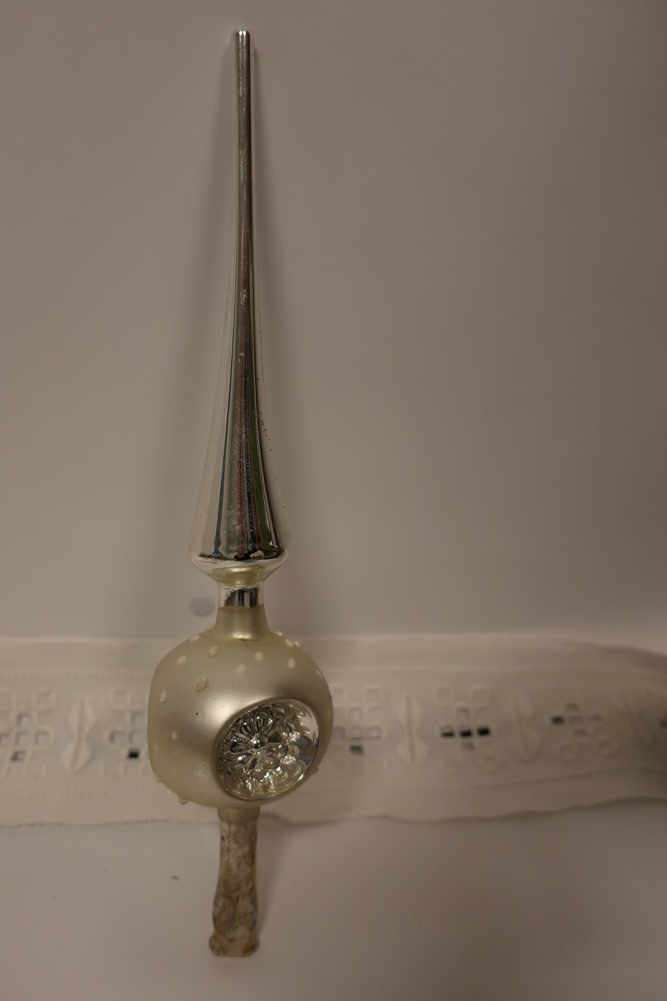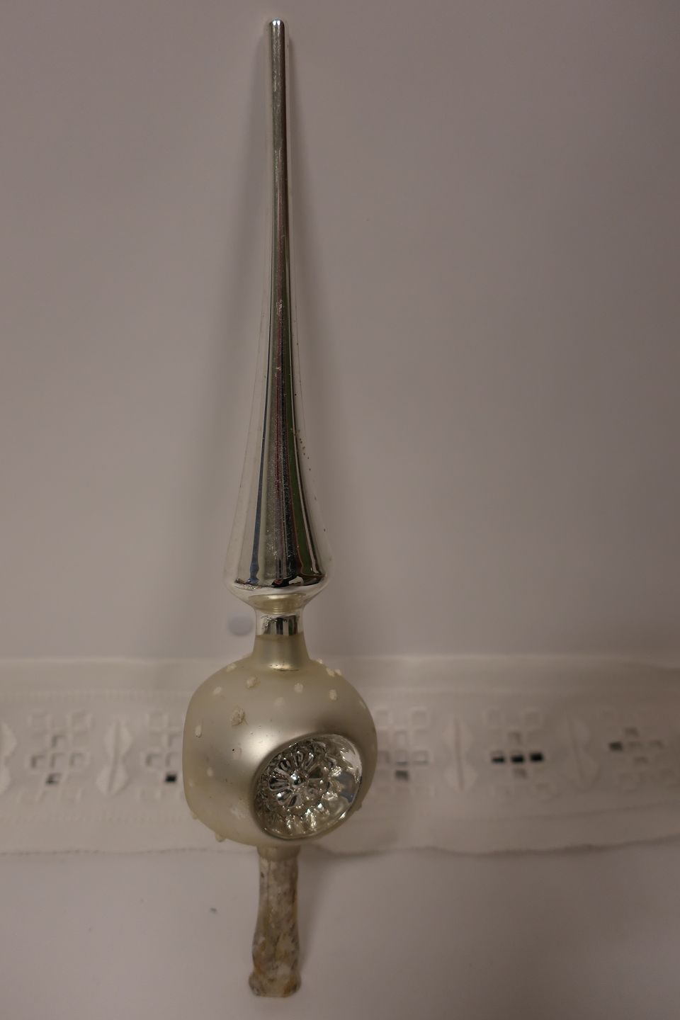 Julespir af glas Gammelt, smukt og enkelt julespir med reflektor, sølvfarvet God stand Varenr.: 4-020112g