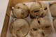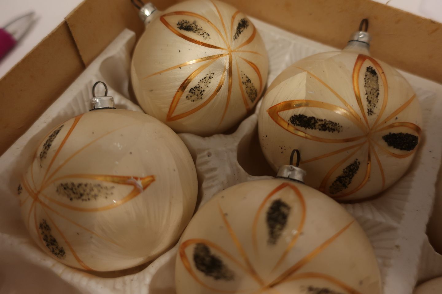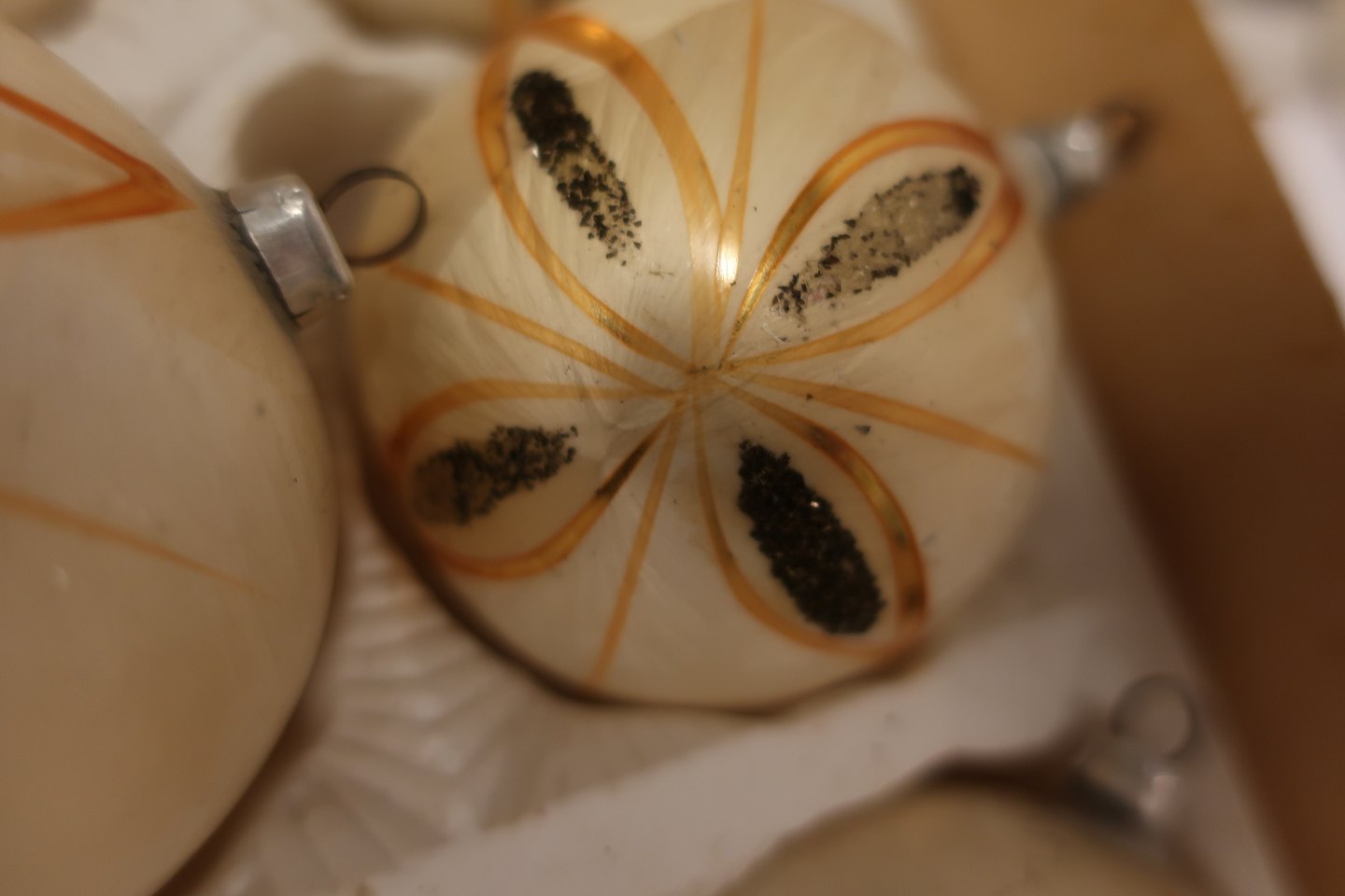 Julekugler af glas Samlet pris for 4 stk. Gamle smukke kugler i beigefarvet "flammet" med guld og sort God og hel stand Varenr.: 4-020112yv