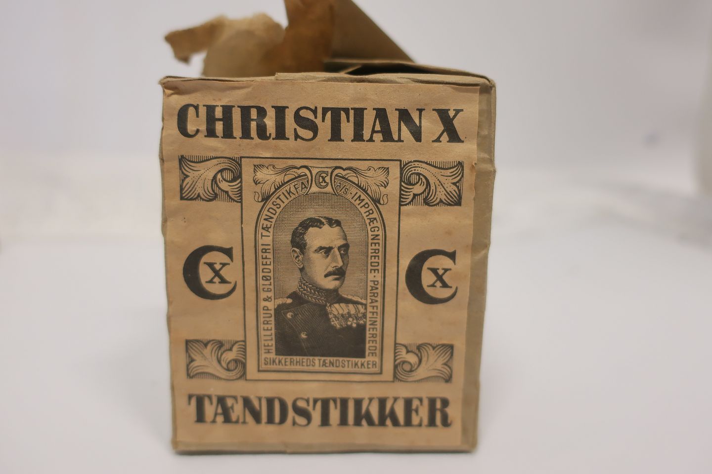 Tekst: "Christian X Tændstikker" og "Hellerup og Glødefri Tændstikfabrik A/S - Imprægnerede - Paraffinerede - Sikkerheds Tændstikker"