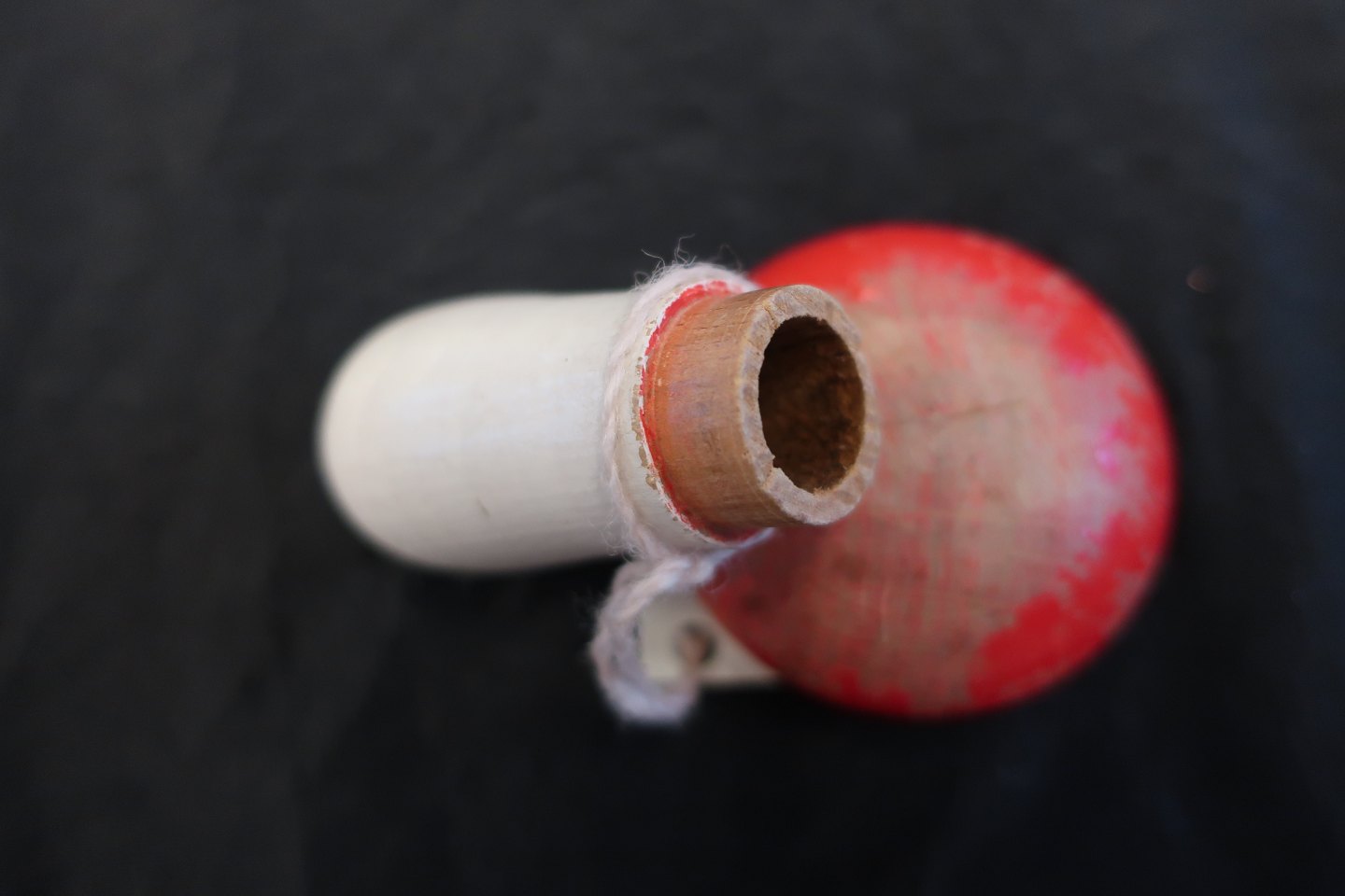 Dette stoppeæg, med form af en paddehat i rød og hvid, kan skilles ad, så der er plads til bl.a. stoppenåle.