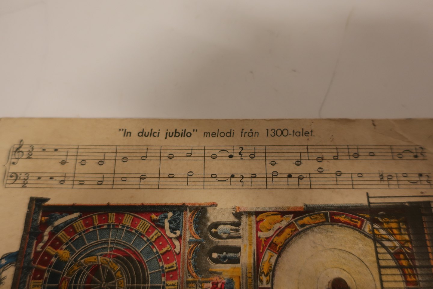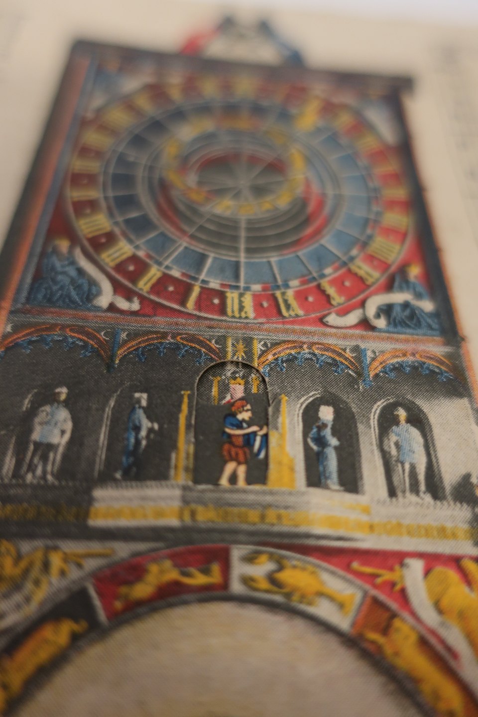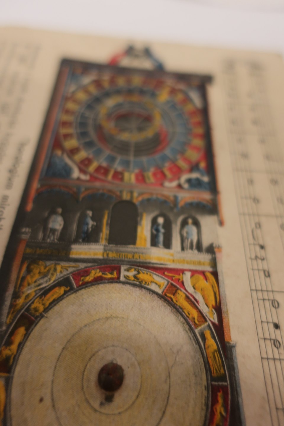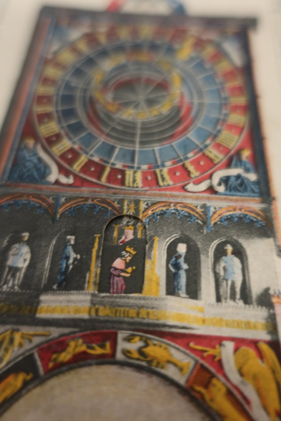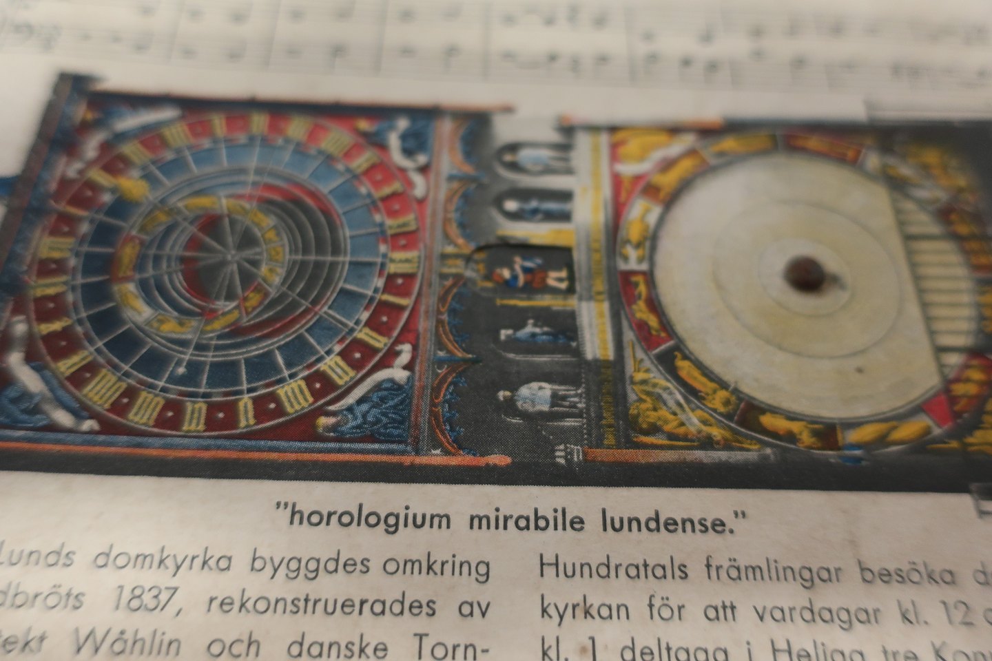 Illustrerer/gengiver det astronomiske ur "Horologium Mirabile Lundense" i Lund Domkirke i Sverige