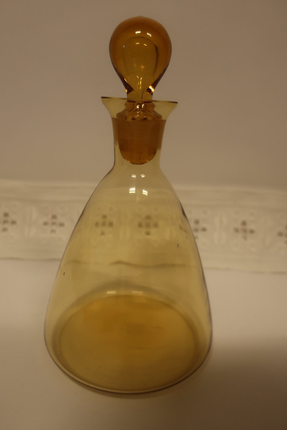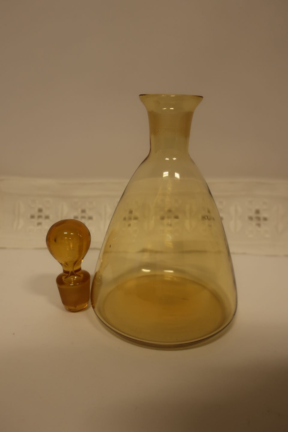 Karaffel, ravfarvet glas, med prop H: ca. 21cm inkl. prop Se venligst også de tilhørende små glas Vi har et stort udvalg af antikke glas, karafler og kander Kontakt os for yderligere information Varenr.: KL1006GL5