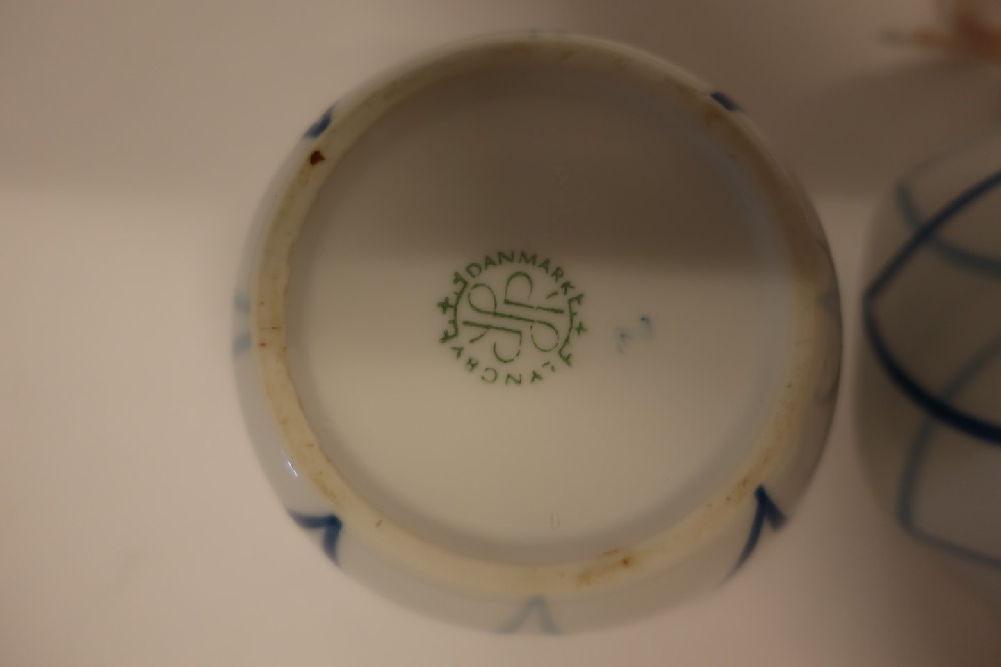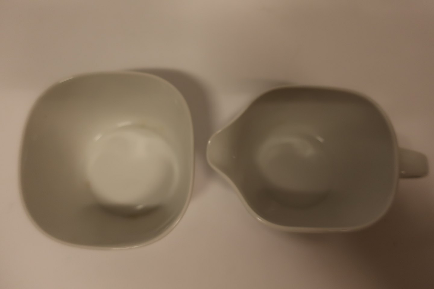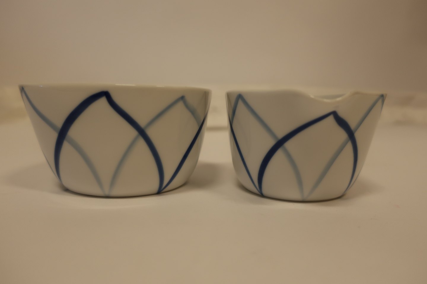 Lyngby - Danild 40 Harlekin - / Blå Flamme mønster Flødekande og sukkerskål som sæt Blev produceret fra 1958 Flødekande mål: ca. 5 x 12 x 7 cm Prisen er for et sæt Varenr.: 4-310103