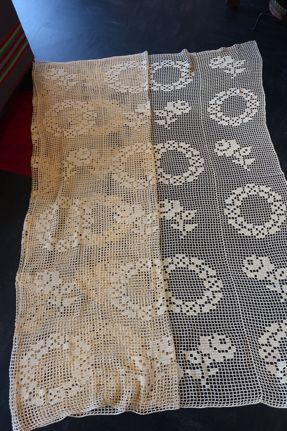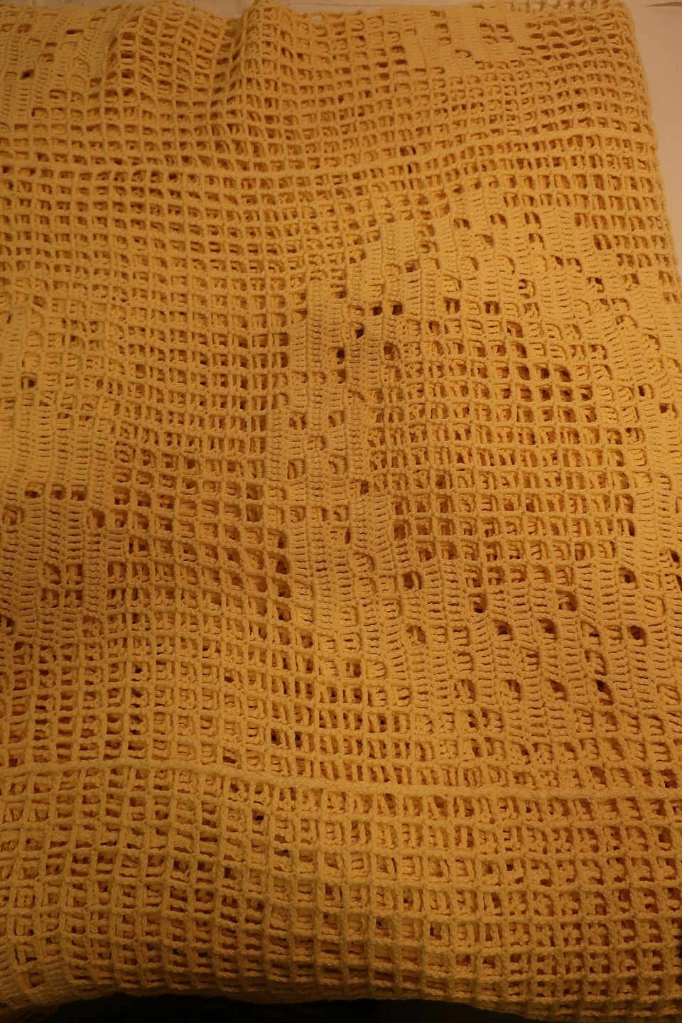 Stort sengetæppe håndhæklet Hæklet i et smukt utraditionelt mønster 240cm x 170cm Farve: Lys gul (farve svært at gengive) God stand Varenr.: 4-61217