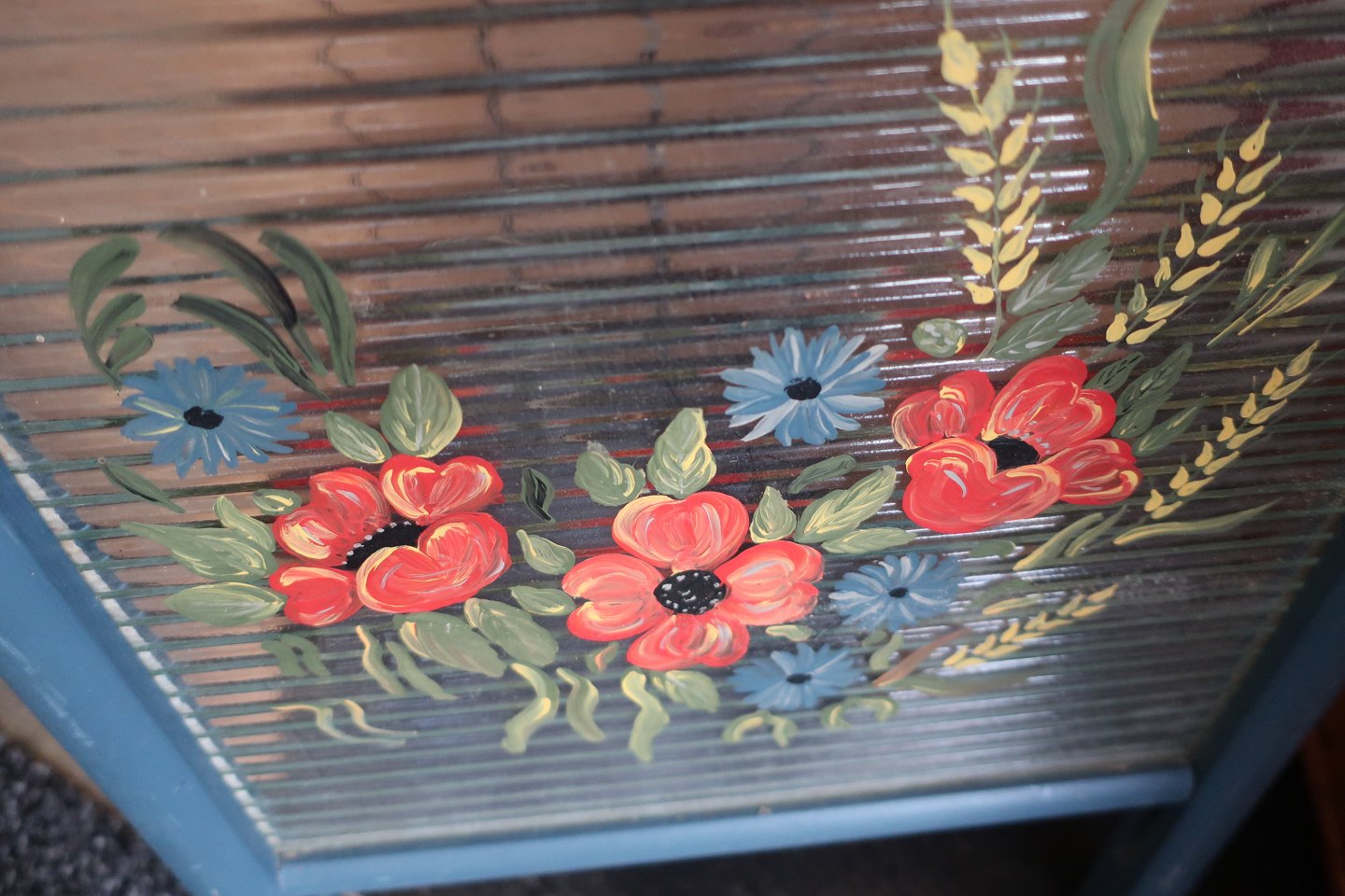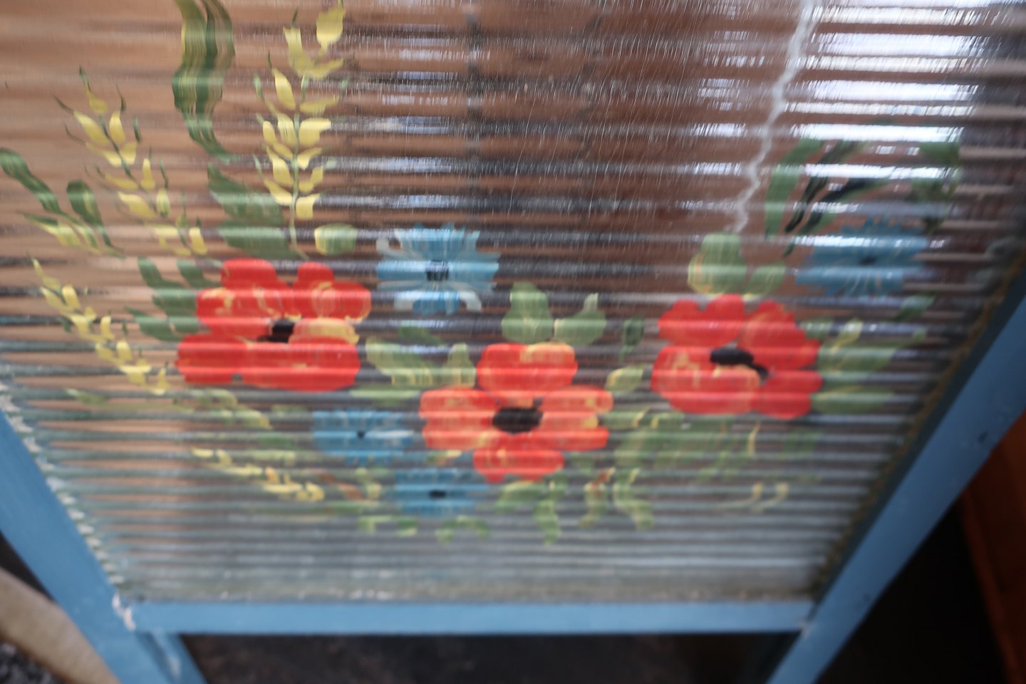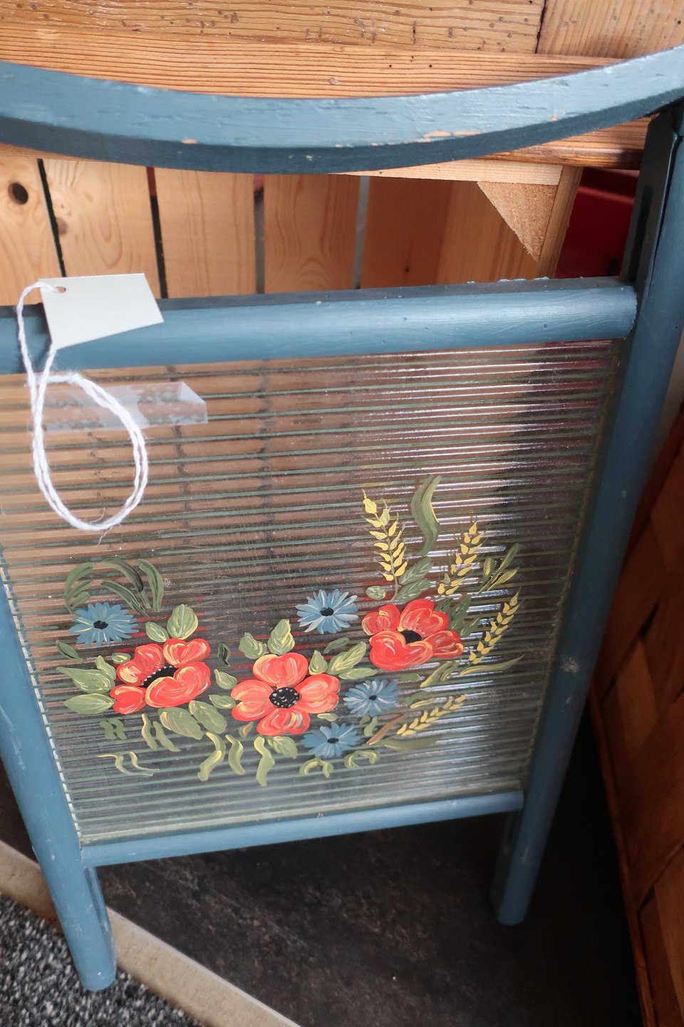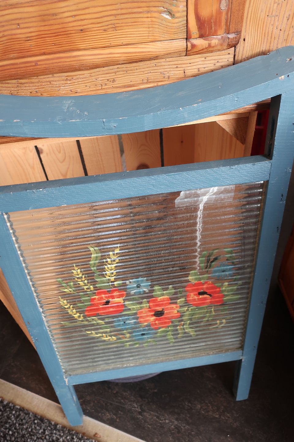 Vaskebrædt Blåt vaskebrædt med bemalet glas God stand Varenr.: 6-11731