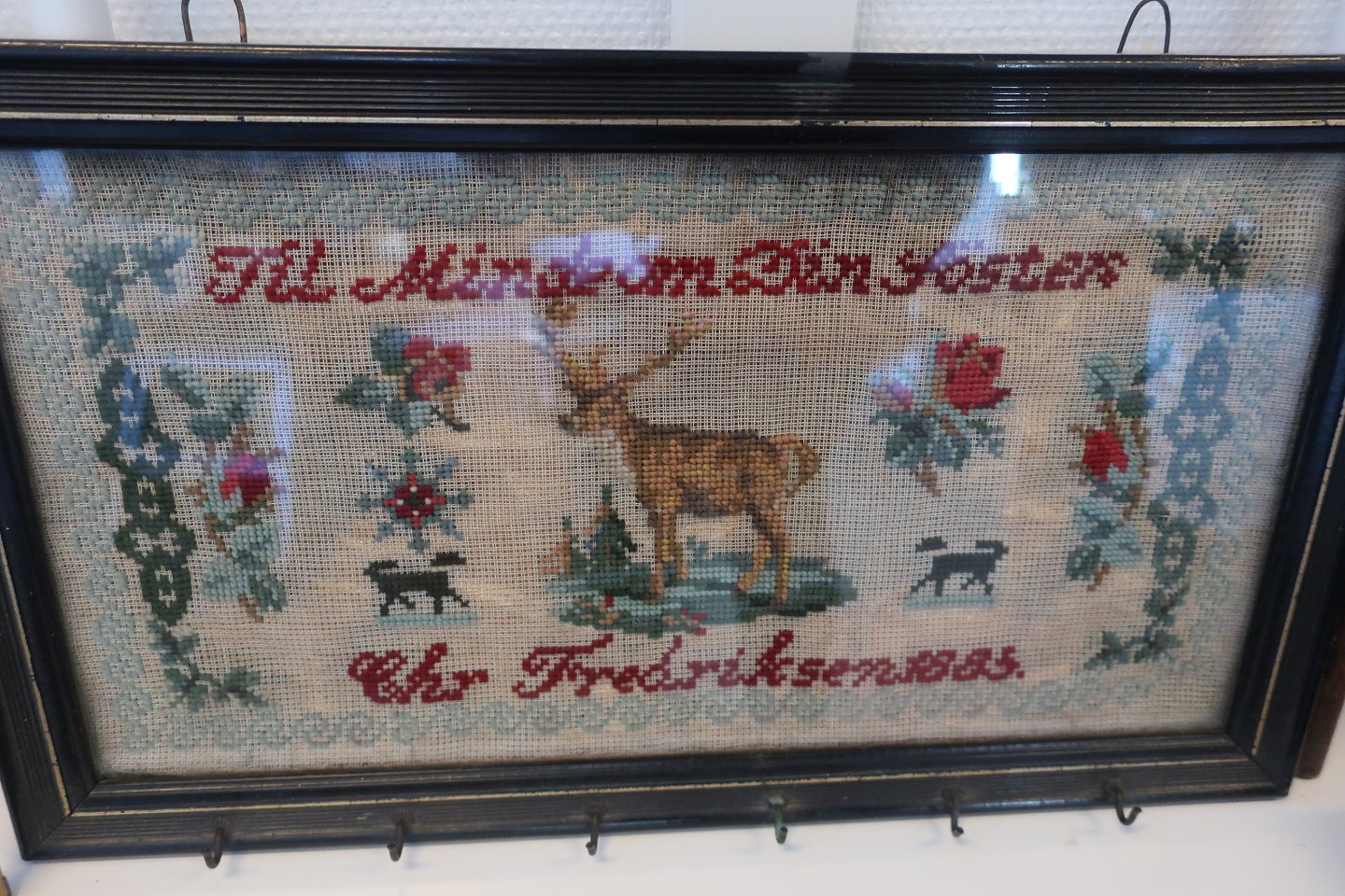 Smukt broderet med korssting, og det broderede er i meget flot stand
