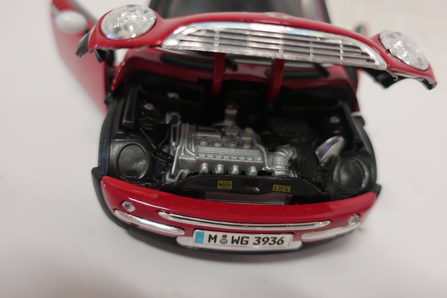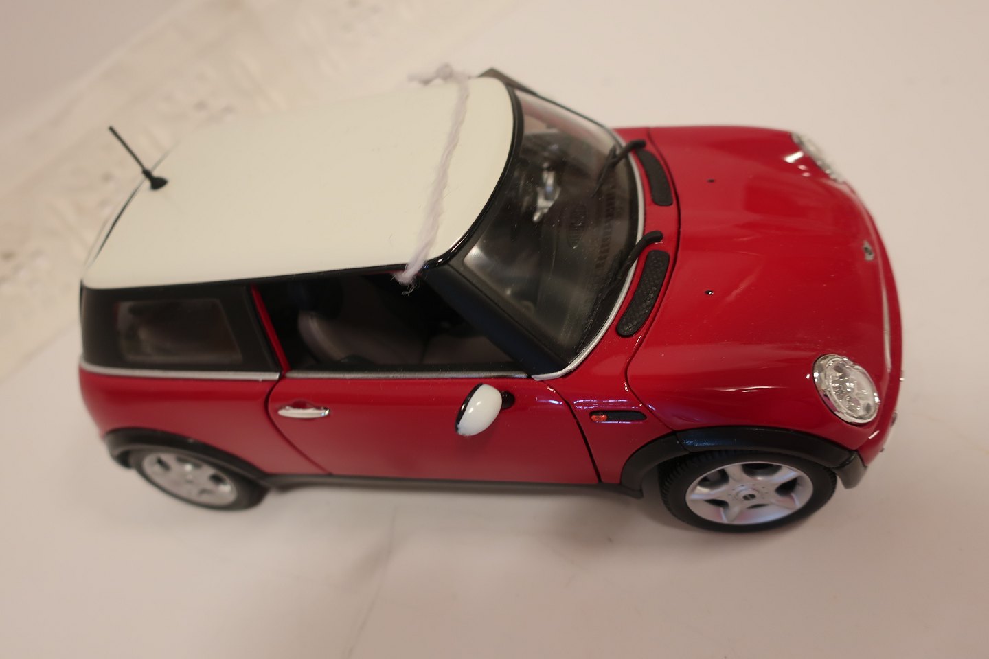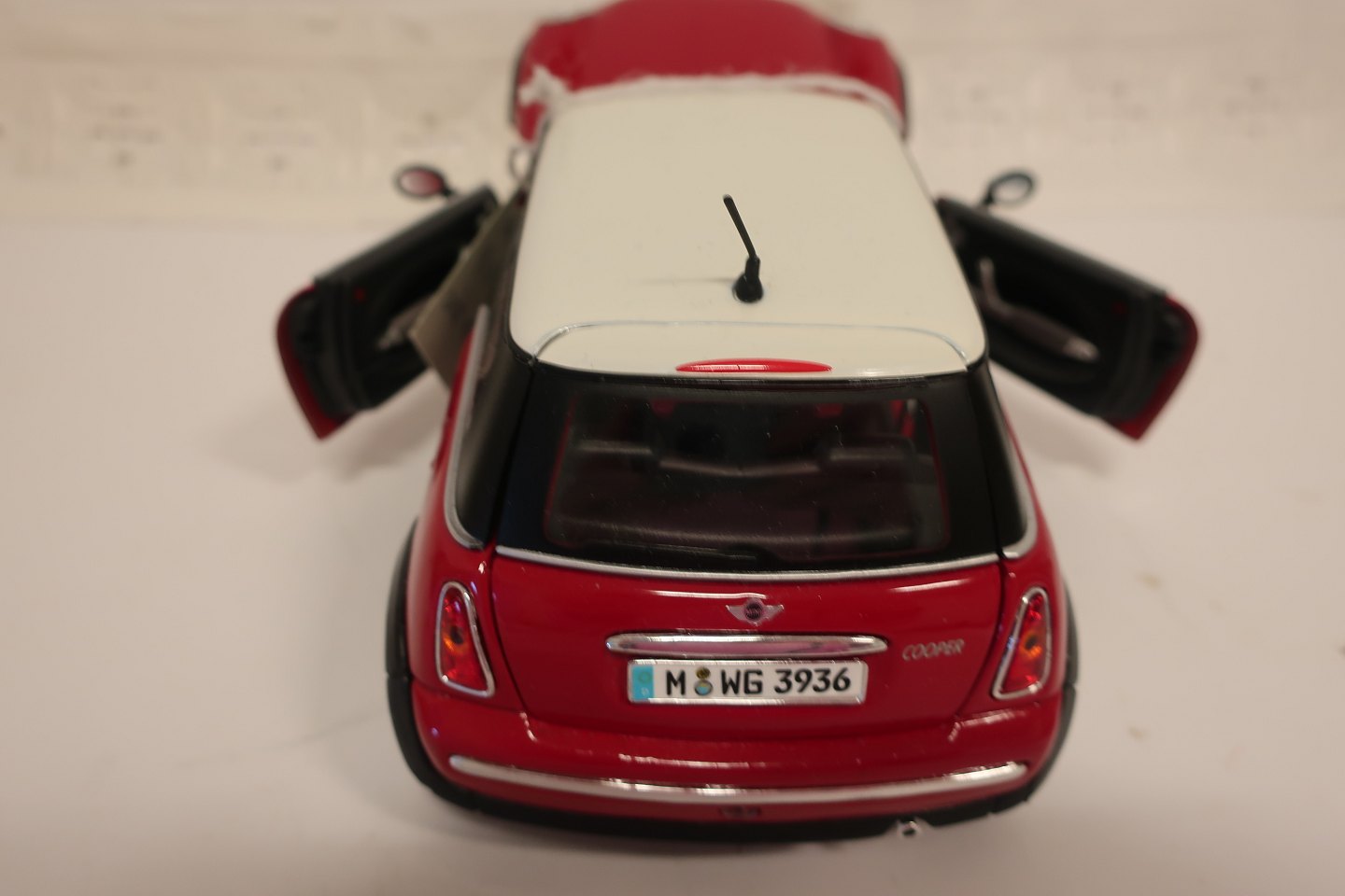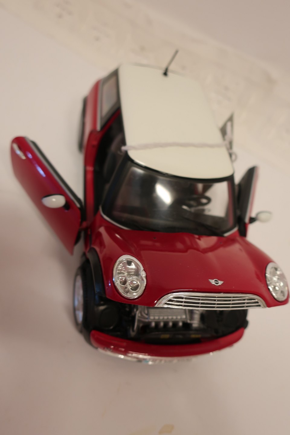 L For samleren: Modelbil Størrelse 1/18 Mini Cooper Maisto Oplukkelige døre og motorhjelm Flot stand Varenr.: 4-12222