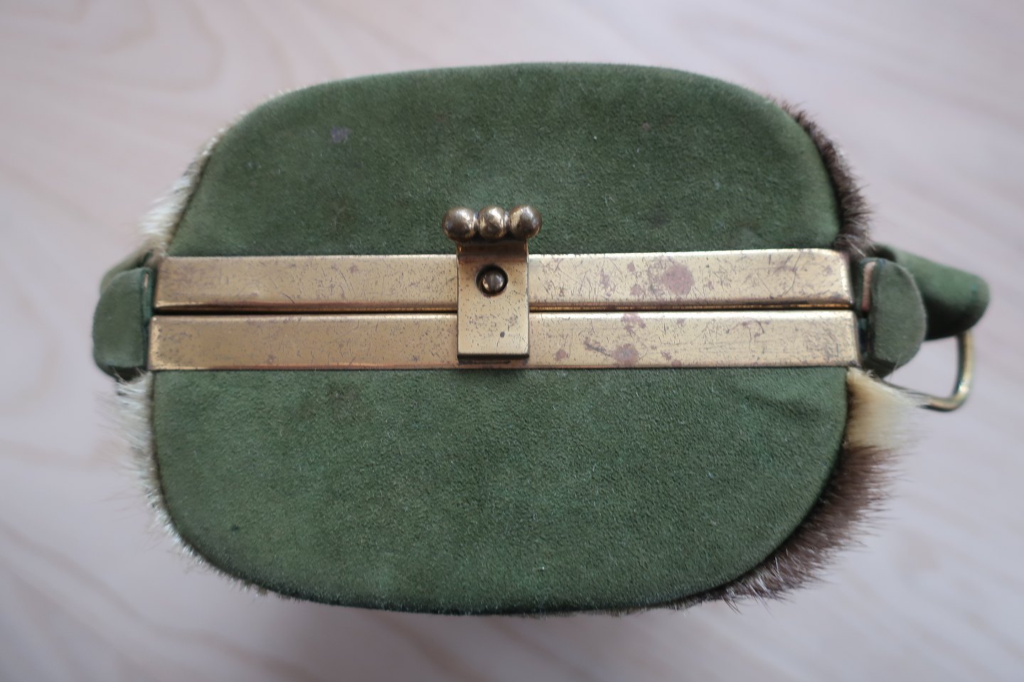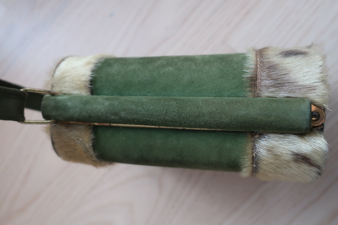 Vintage taske med skindbesætning Tasken anvendes på højkant Med rem God stand udvendig og indvendig, men med lidt slid på skindet Varenr.: 4-11162