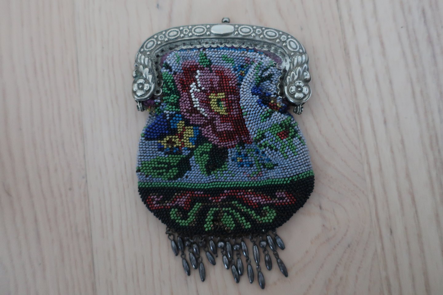 Den gamle taske fra ca 1910 er lavet som håndlavet perlebroderi med smukt mønster af roser