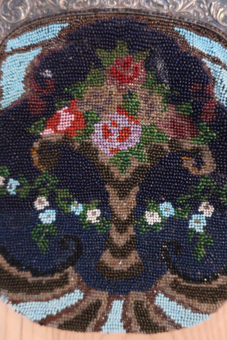 Den gamle taske fra ca. 1880 er lavet som håndlavet glasperlebroderi med smukke mønstre