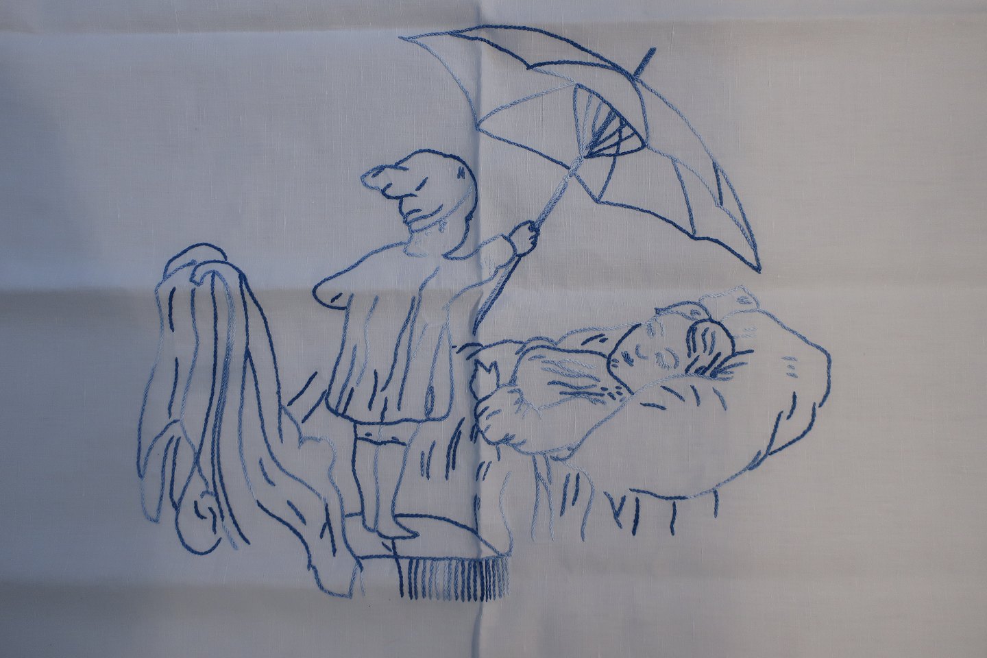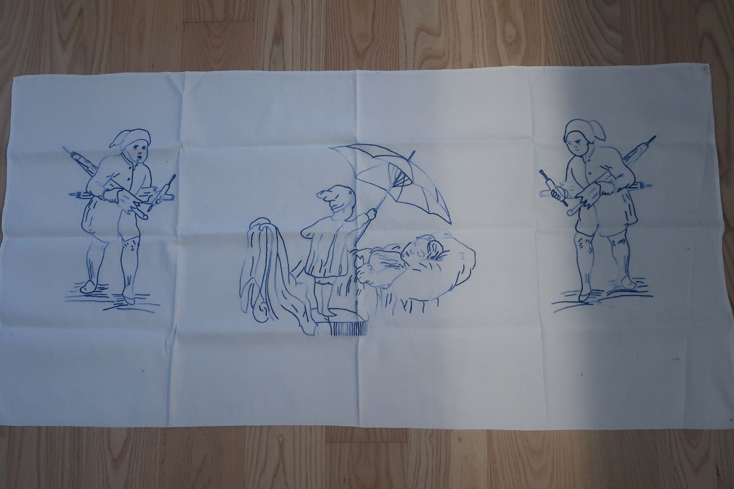 Smukt gammelt broderet stykke med blåt håndbroderi